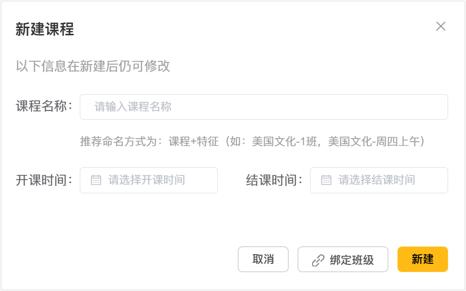 点击 新建课程 ,进入新建课程页面。填写课程名称和开课时间,点击 新建 ,即可新建课程。