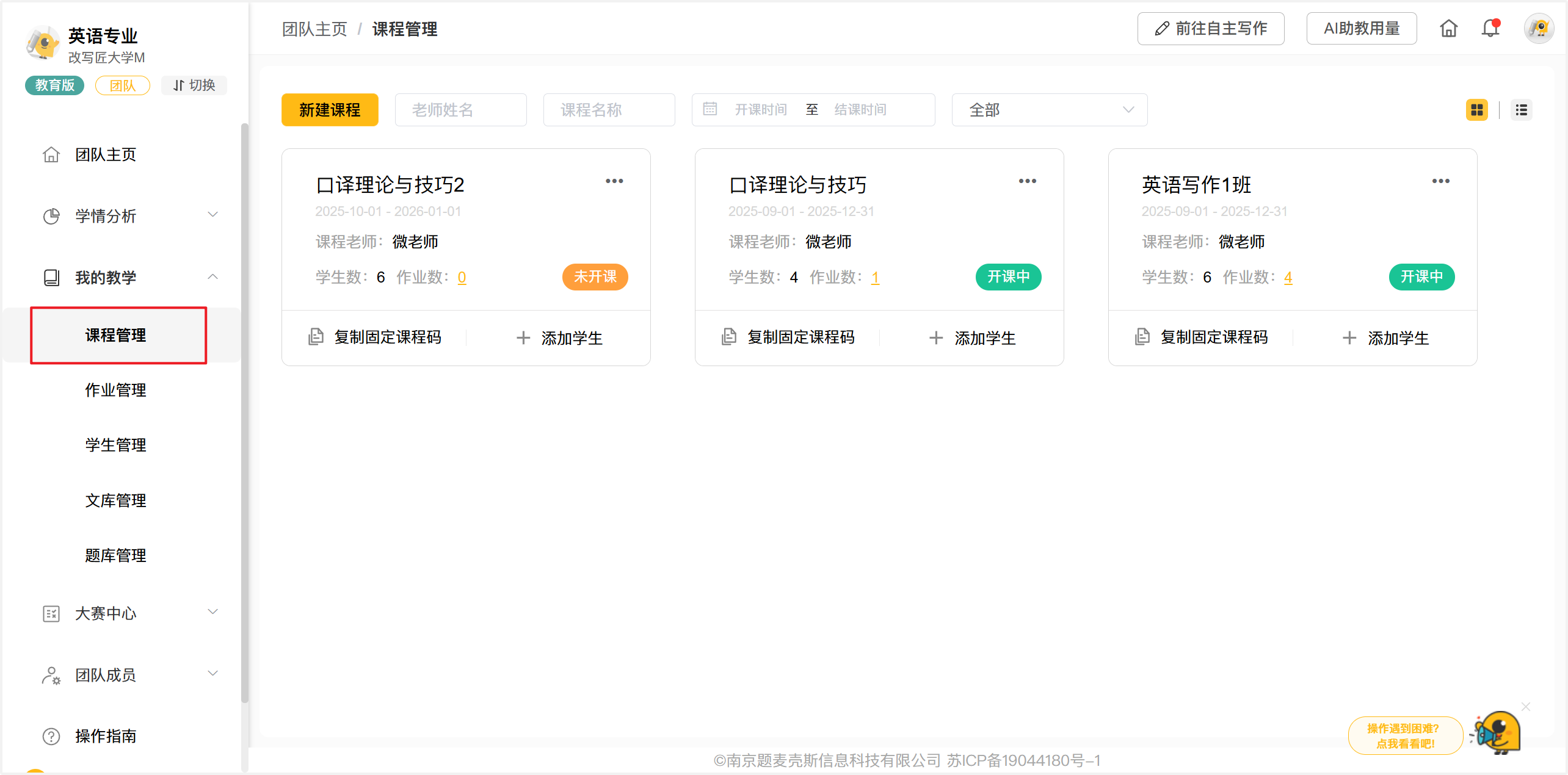 改写匠教育版的作业布置是以“课程”为单位的。一个课程支持布置多个作业,支持导入多个班级的学生,并设置多位老师共同管理。