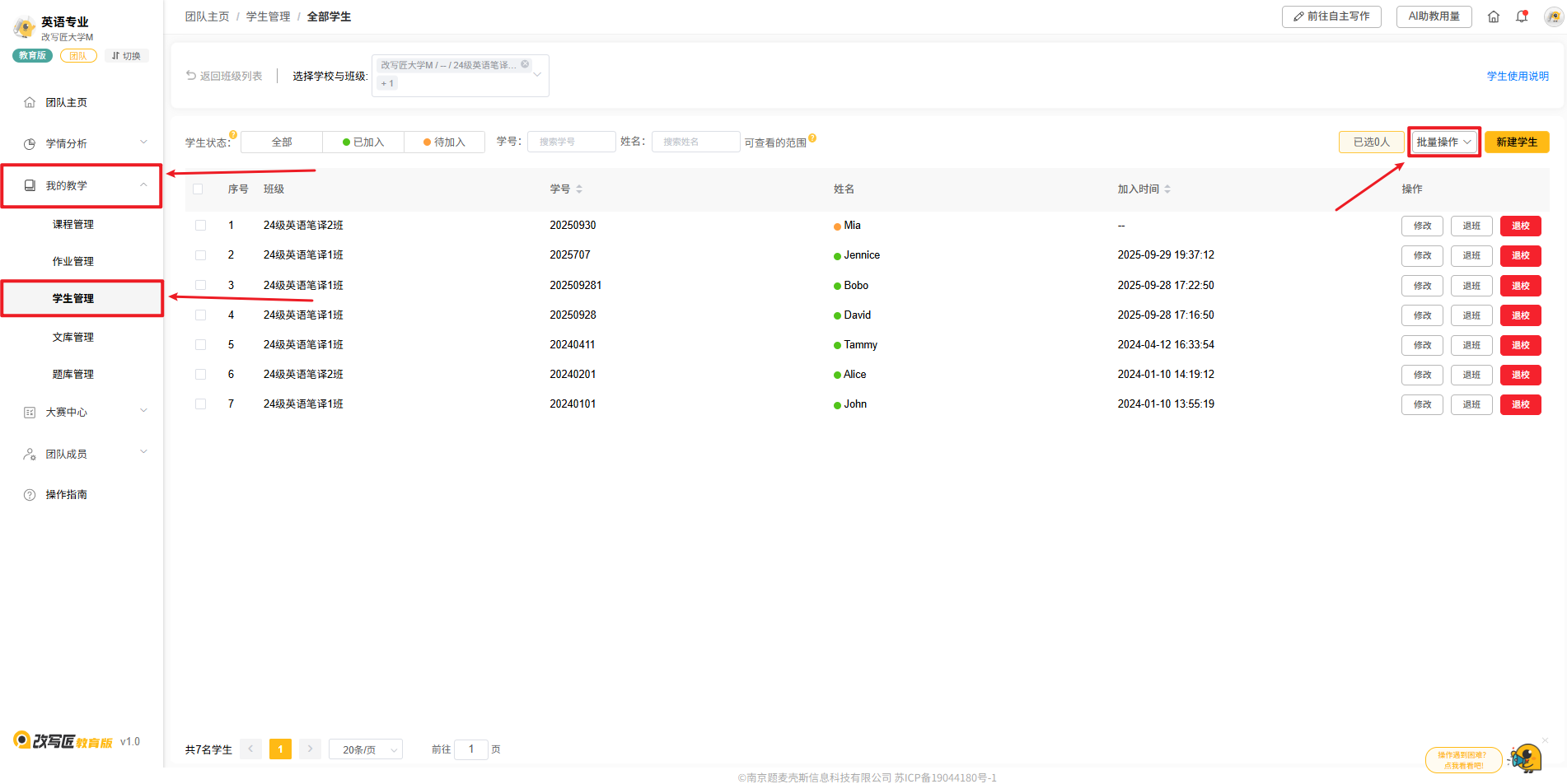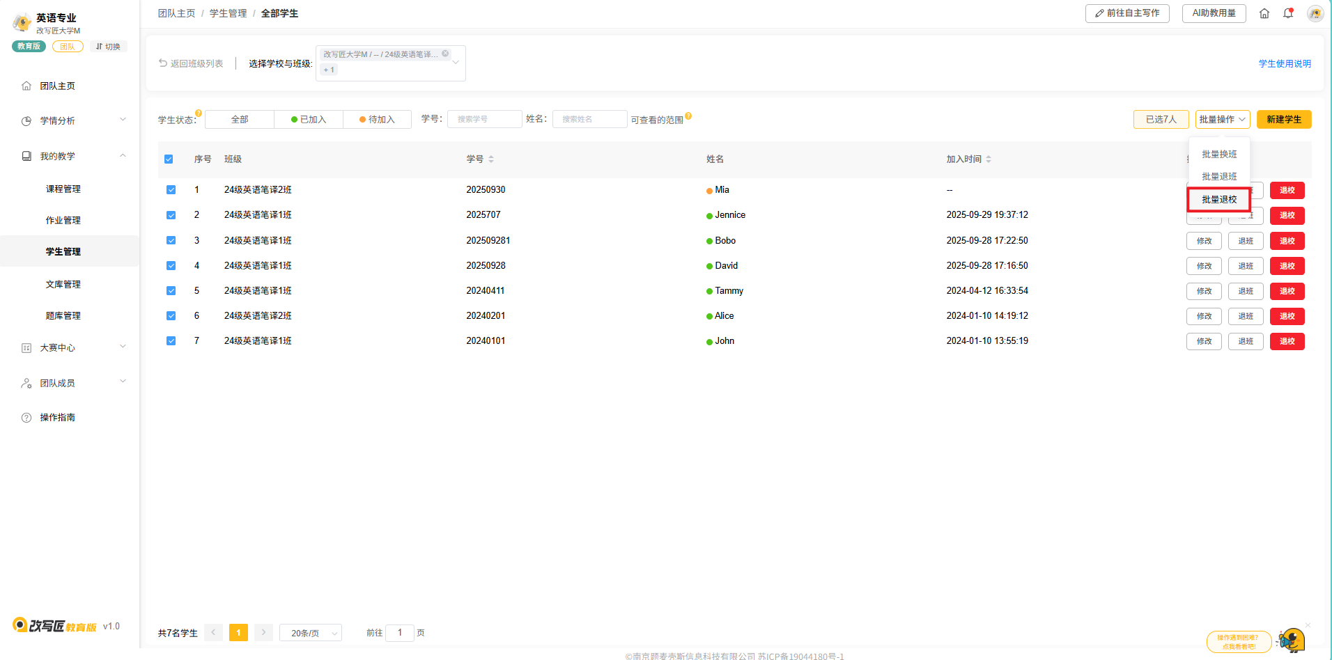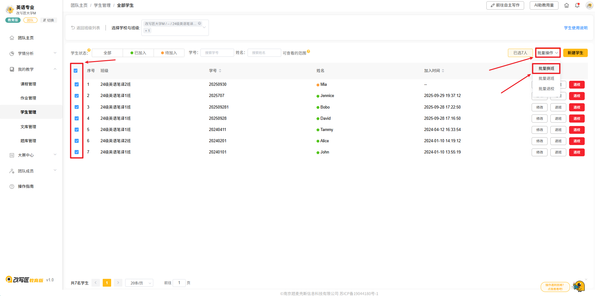 改写匠教育版支持在学生池内批量管理学生信息,包括: 批量换班、批量退班和批量退校 操作。