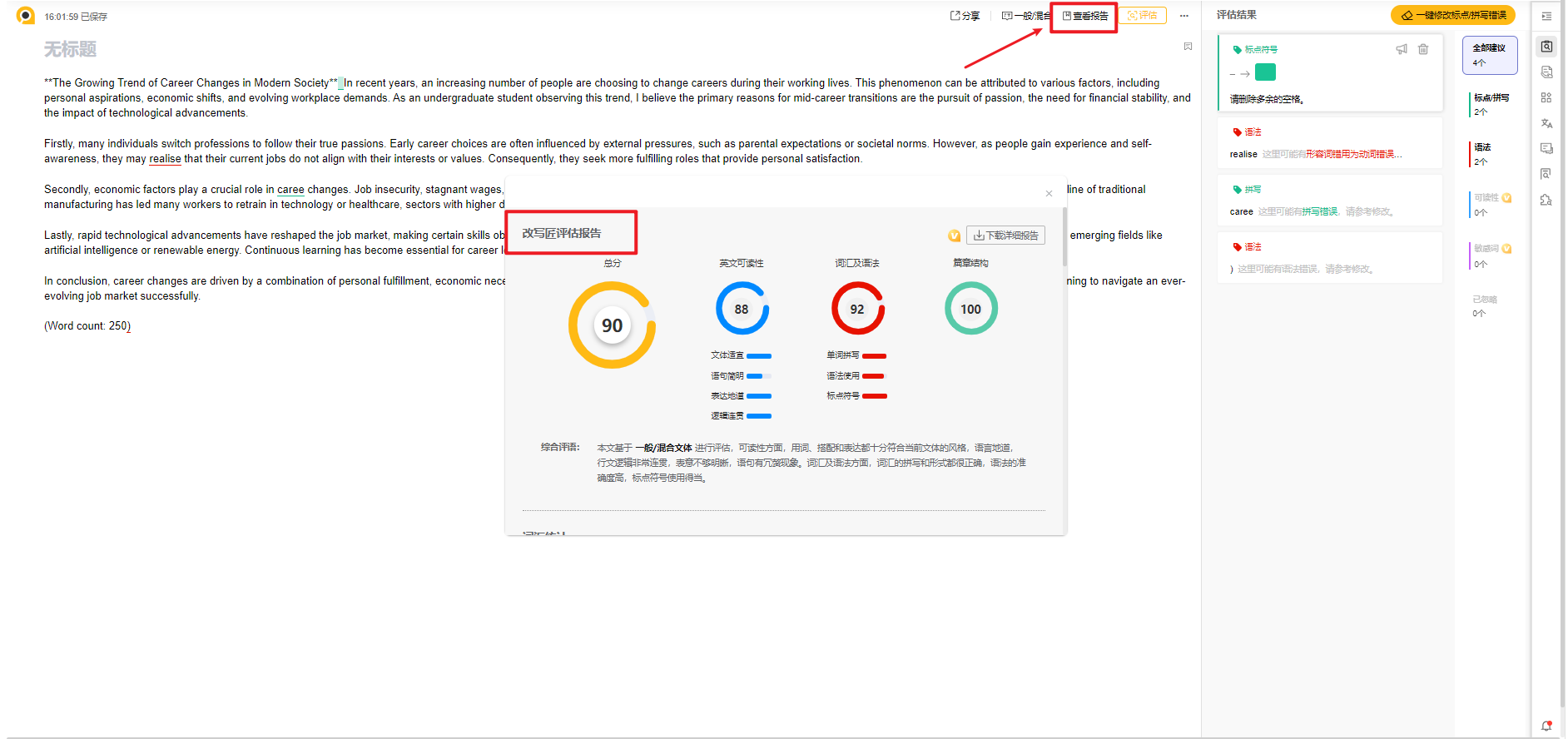 改写匠可基于地道语料大数据,智能评估 文章,根据文体适宜、逻辑连贯、表达地道、语句简明 四个维度、近20种 写作指标,给出一份综合的评估报告,帮助您了解自己的表达习惯和写作特点。