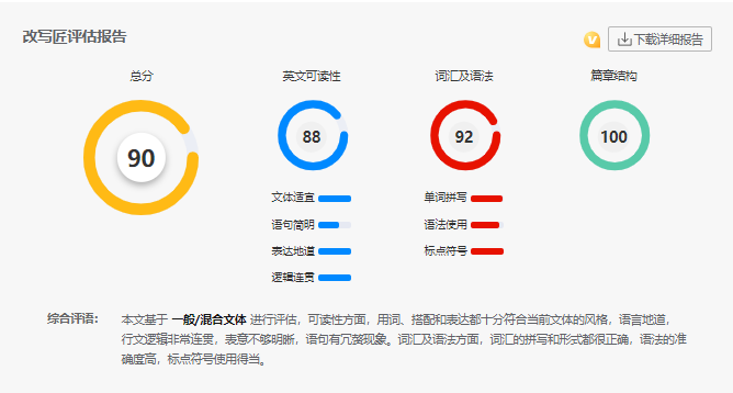 文章总分由三个维度的分数加权得出,分别是:英文可读性、词汇及语法、篇章结构。每个维度的分数都是100分,总分为三者加权后的分数。