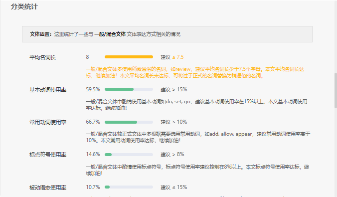 建议包括:文体适宜、逻辑连贯、语句简明和表达地道 四个类别。文体不同,对应的数字指标也不同,您可以根据自己的写作特点,选择性的关注某些指标。