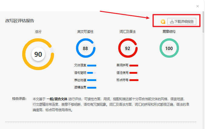 改写匠的评估报告分为四部分:综合评价、词汇统计、总体统计、分类统计。