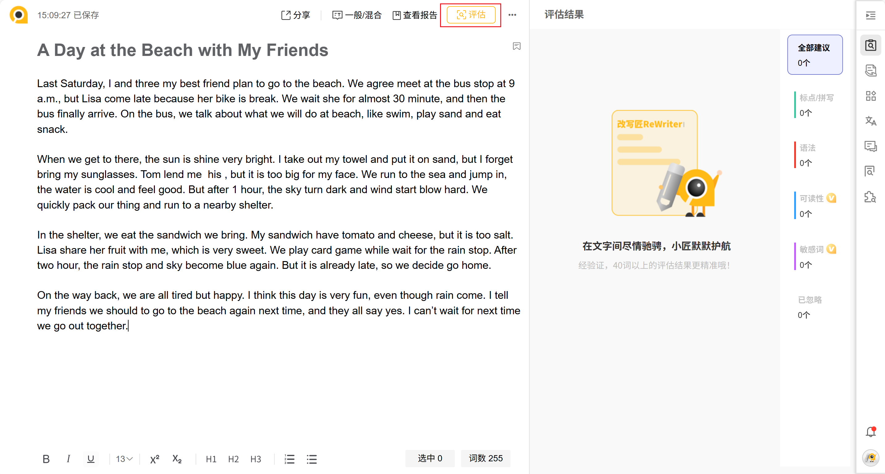 改写匠支持 七个维度 的AI智能评估,包含拼写、语法、标点等语法准确性检测和适宜性、简明性、地道性(中式英语)和逻辑连接性等英文可读性检测。智能评估的使用步骤如下: