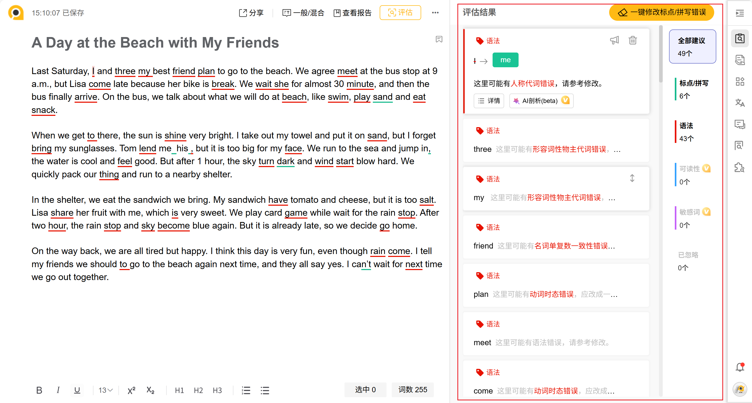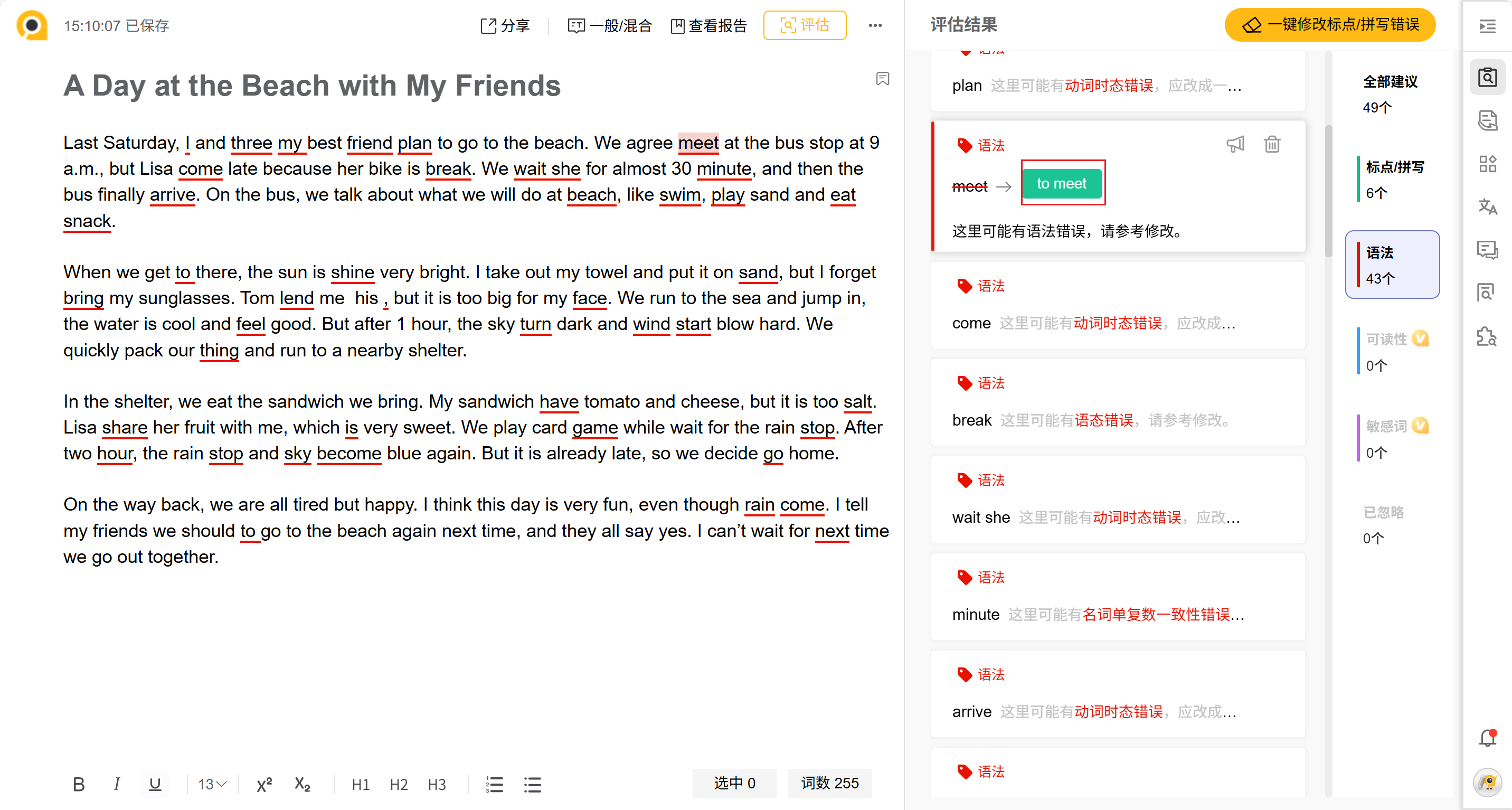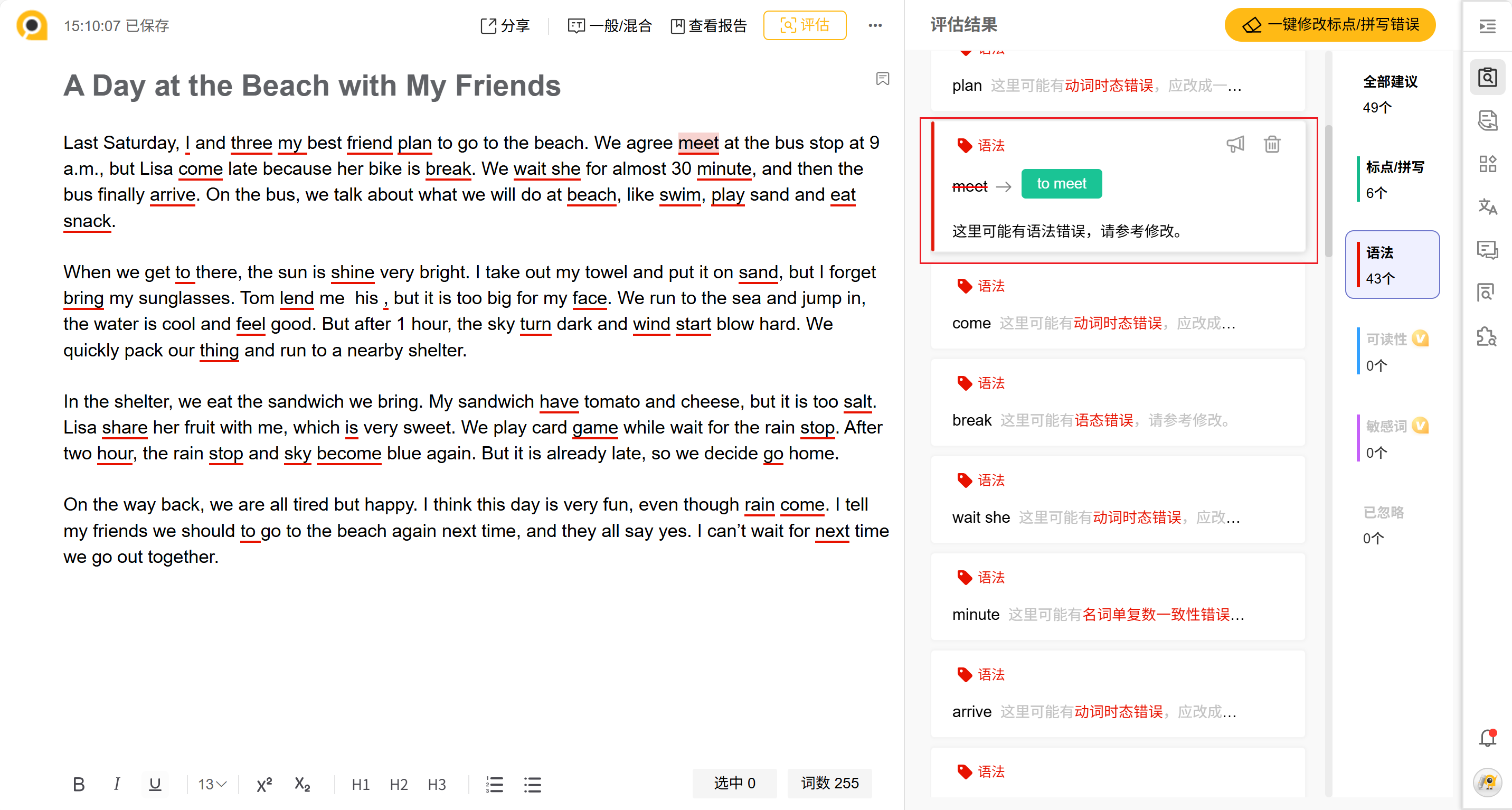 点击左侧带有 红色或蓝色 下划线的文本,即可展开右侧的批改建议卡片,同样,点击右侧建议卡片,也会自动高亮左侧的文本。点击 详解 可查看该建议的语法详解。