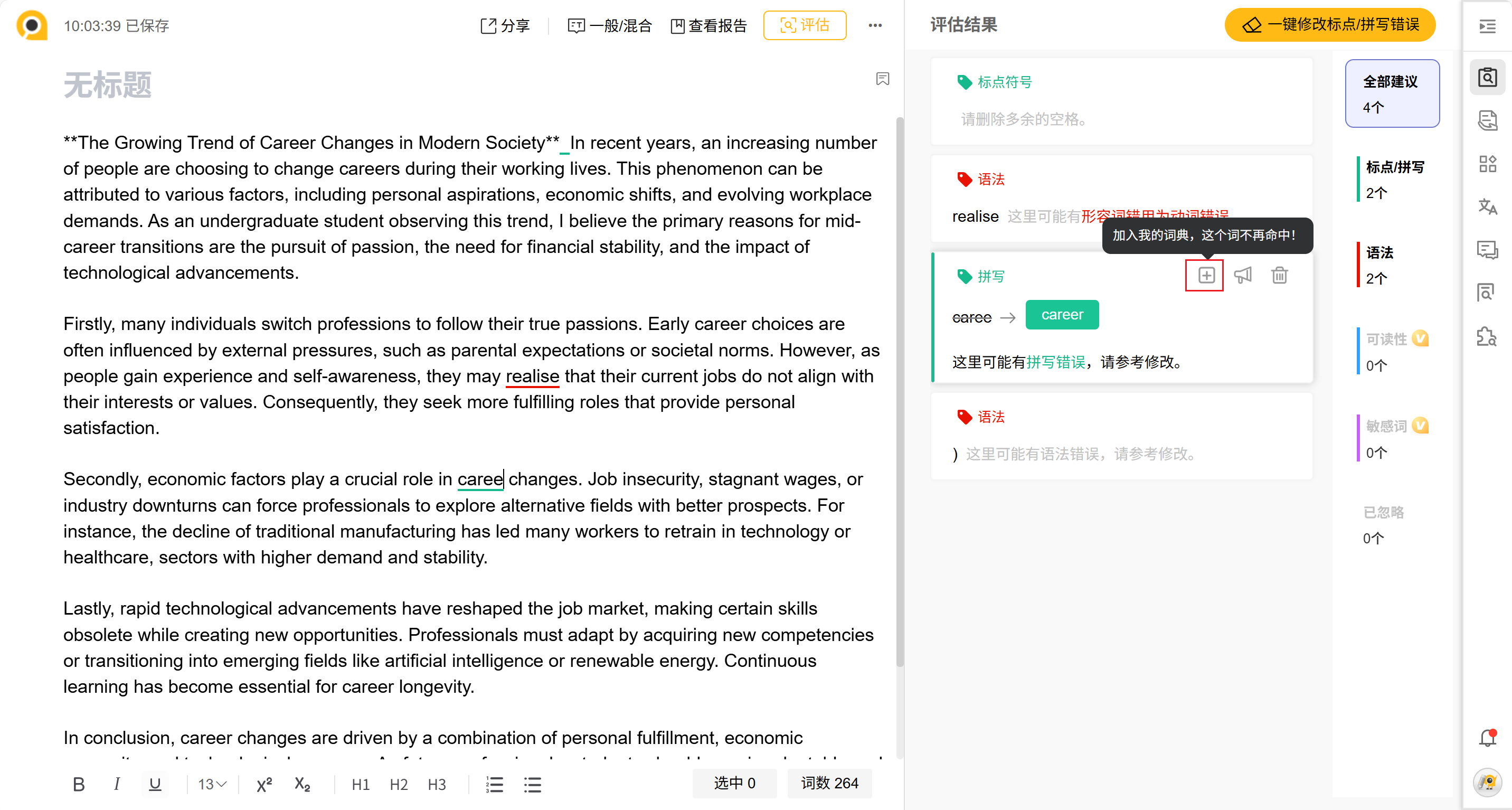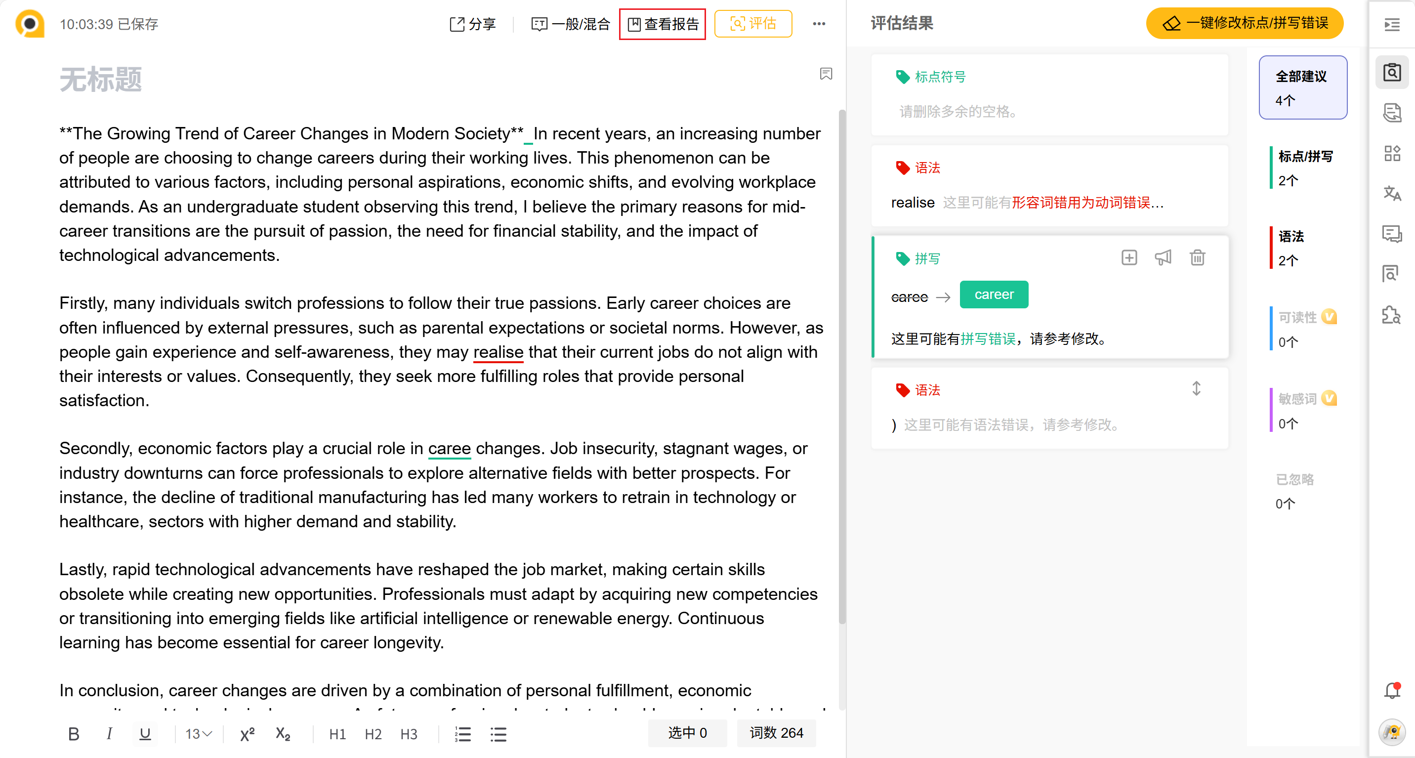 点击右侧建议卡片中绿色高亮的位置,即可在文章中一键 应用 批改建议。