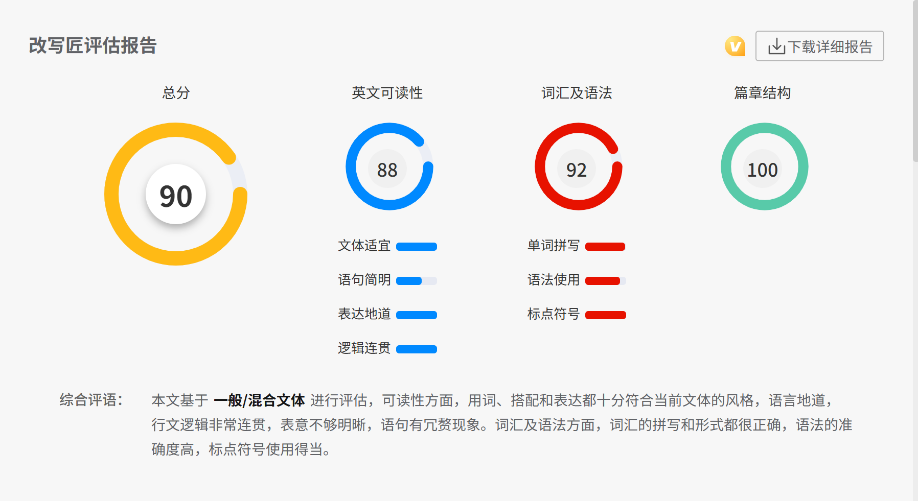 点击报告页面右上角的 下载详细报告 按钮,可下载详细PDF报告(改写匠VIP会员专属功能)。