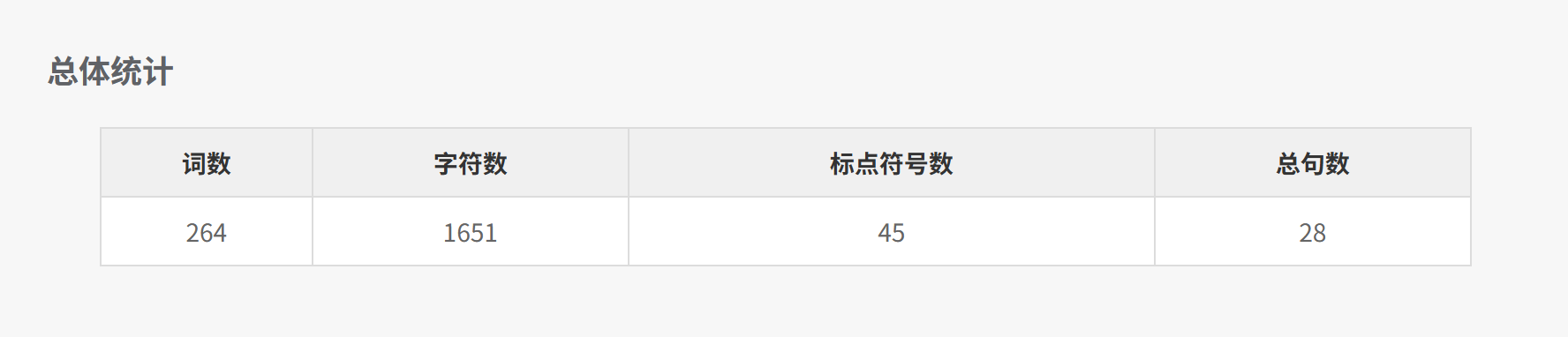 总体统计 部分,改写匠将统计您文章的词数、字符数、标点符号数与总句数。