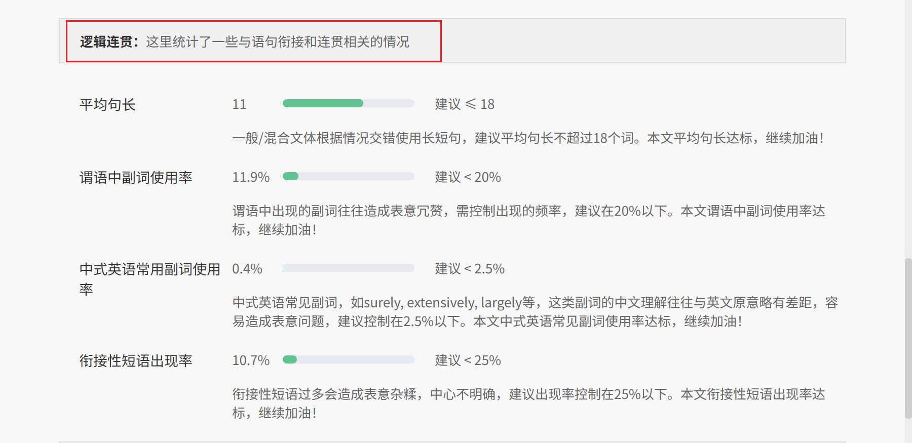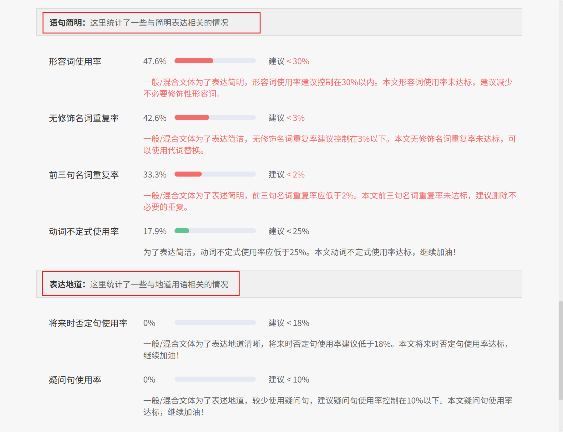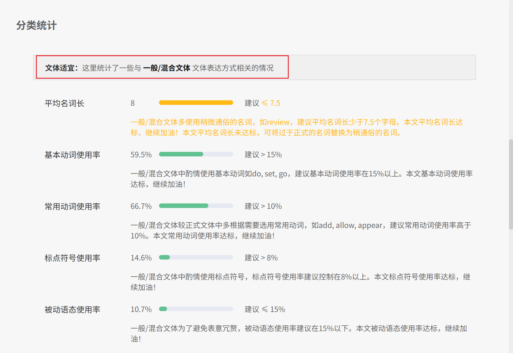 建议包括:文体适宜、逻辑连贯、语句简明和表达地道 四个类别,共20多种写作指标。文体不同,对应的数字指标也不同,您可以根据自己的写作特点,选择性的关注某些指标。
