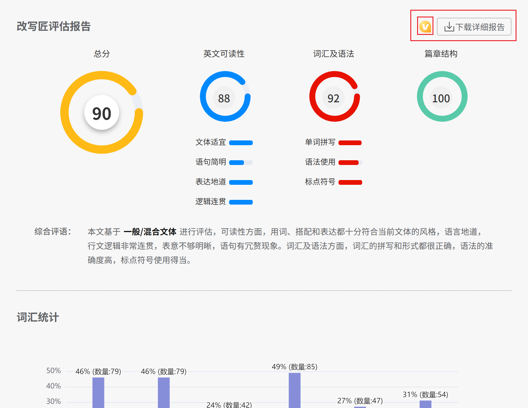 改写匠的评估报告分为四部分:综合评价、词汇统计、总体统计、分类统计。