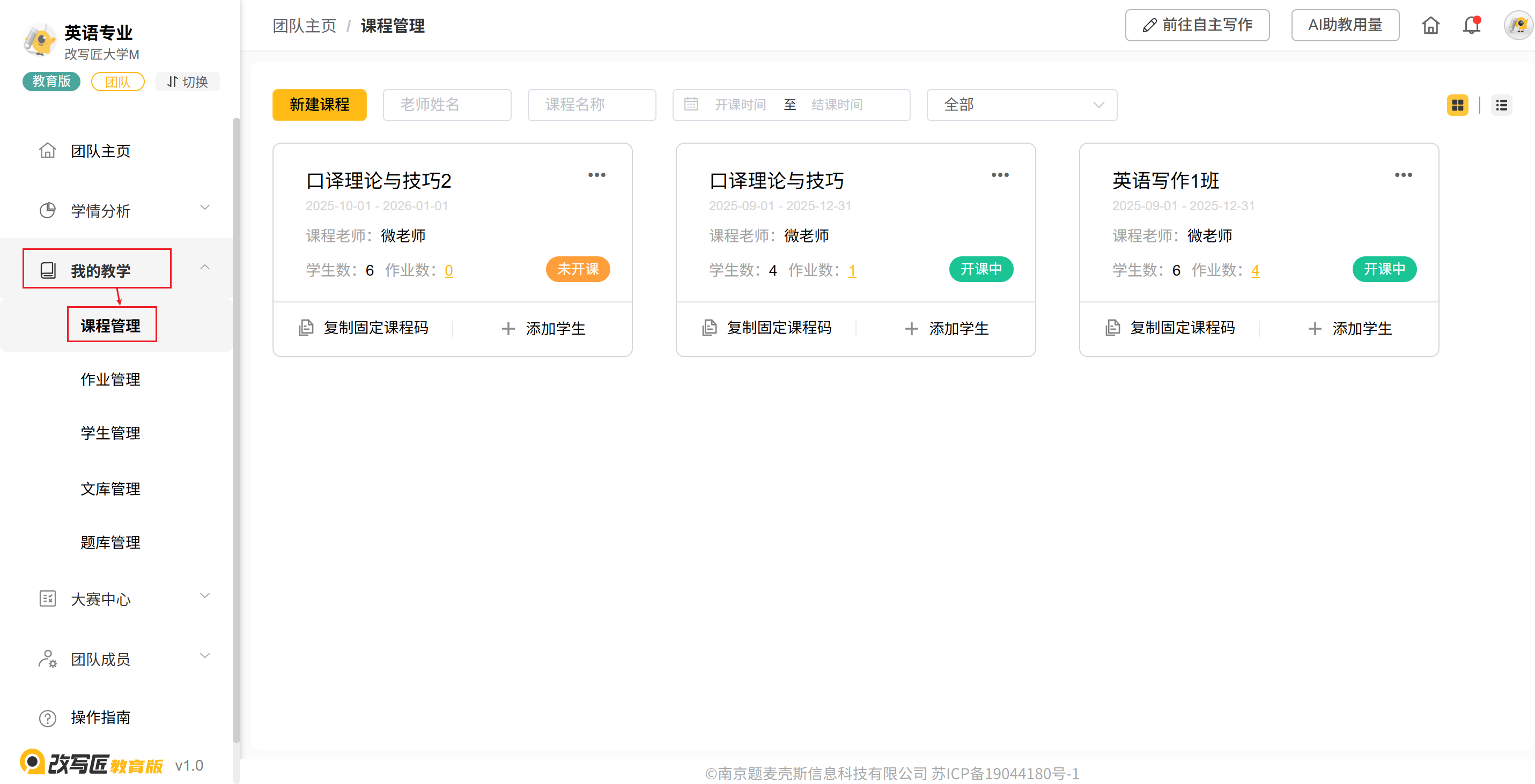 在 课程详情 页面,课程老师可以查看当前课程的作业和成绩。在团队主页 我的教学-课程管理,点击任意课程卡片,即可进入课程详情页面。