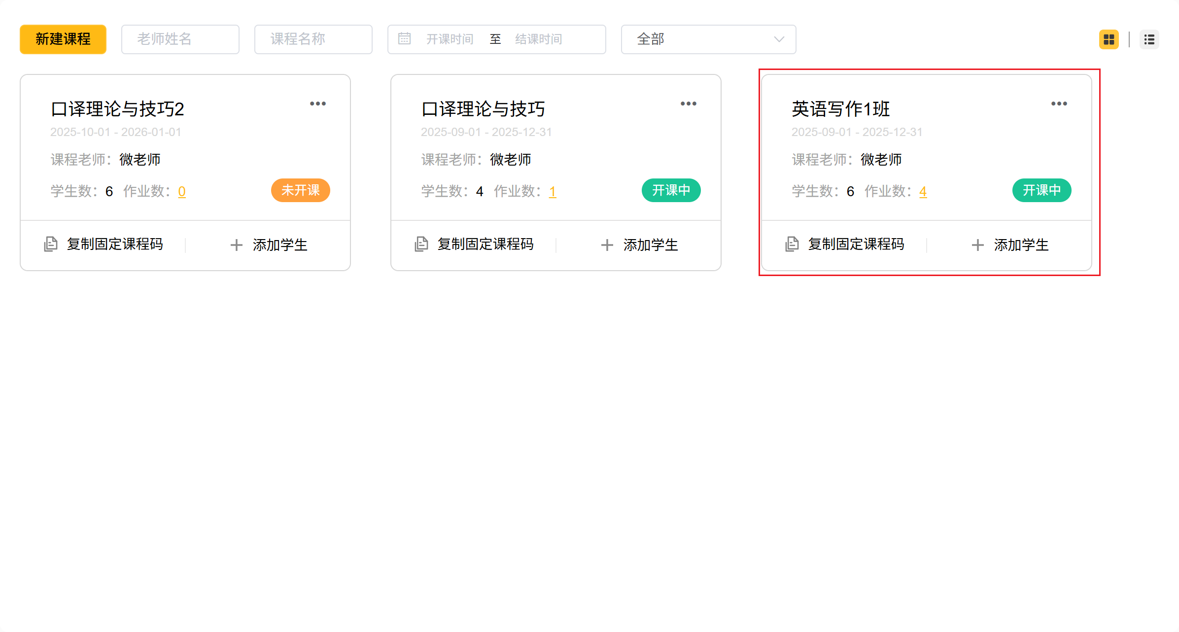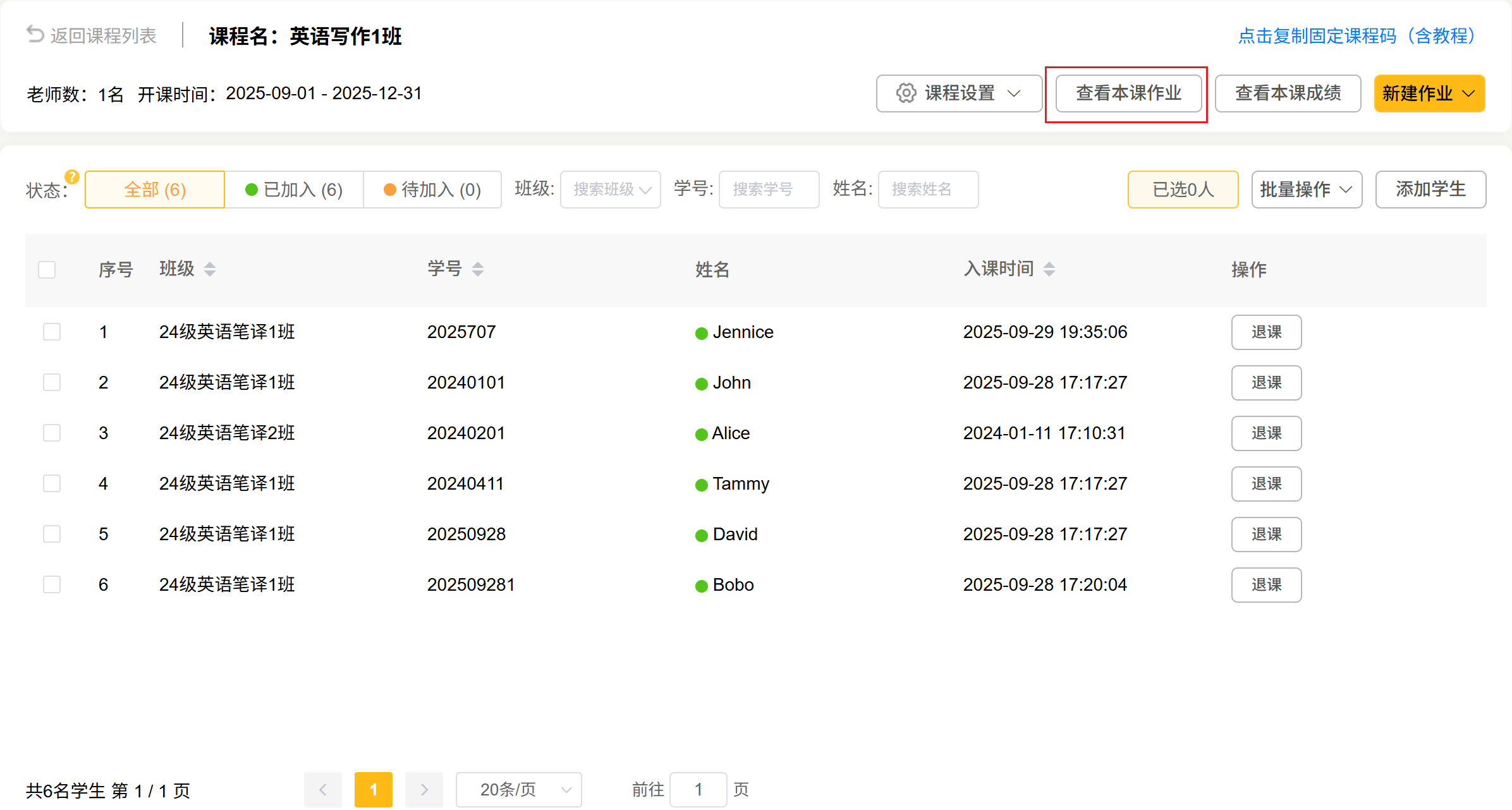 点击 查看本课作业 ,即可跳转至 作业管理 页面,查看当前课程的作业情况。