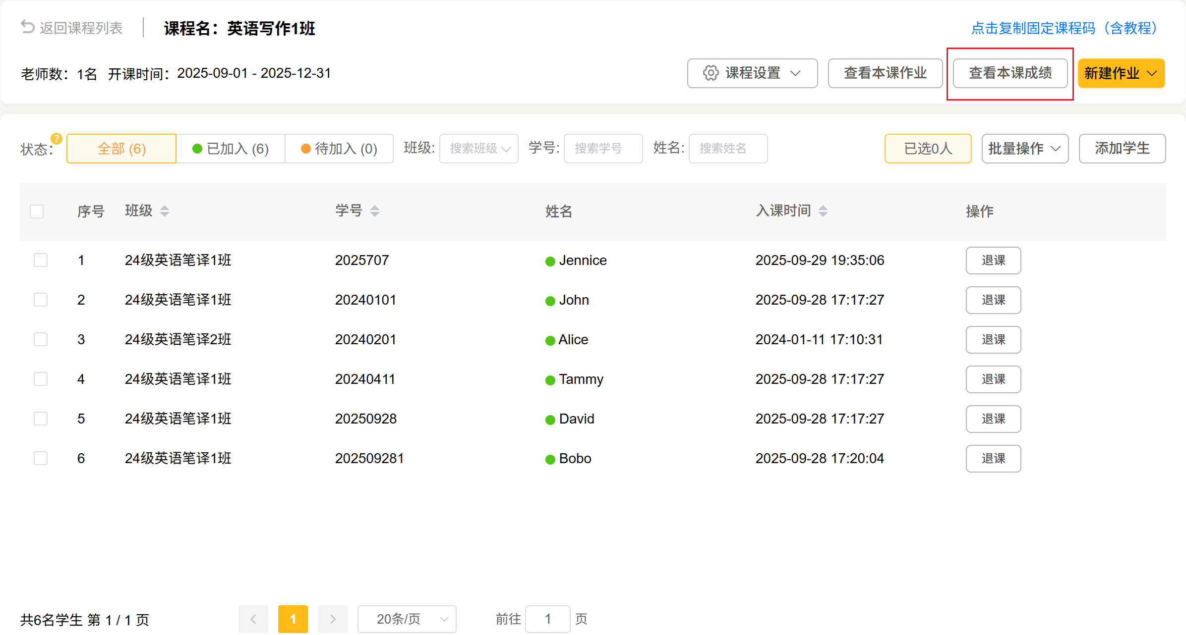 点击 查看本课成绩 ,即可跳转至 成绩看板 页面,查看当前课程的学生成绩。