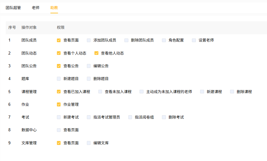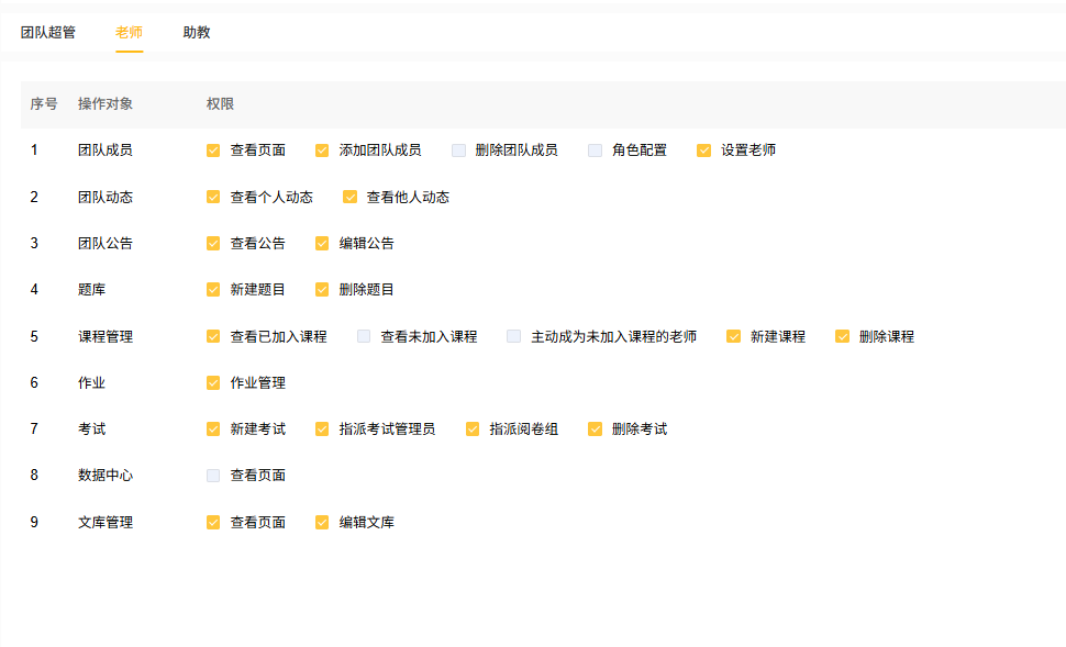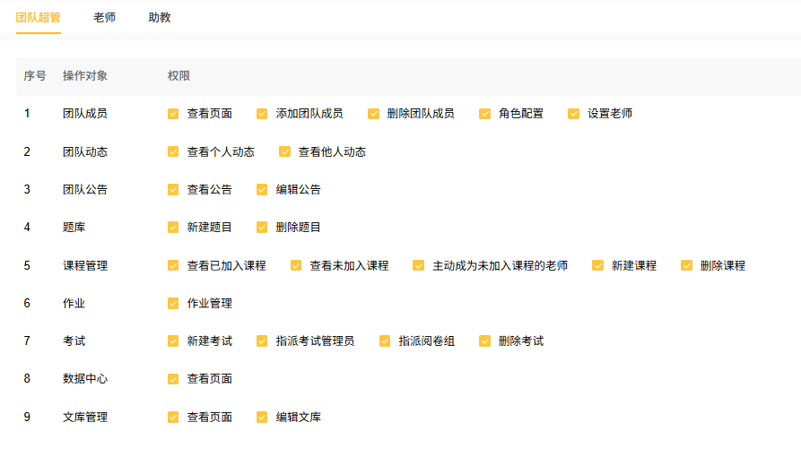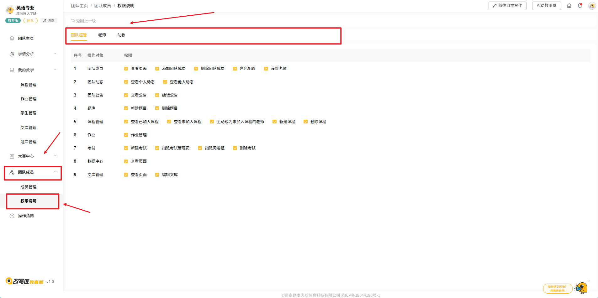 改写匠教育版中,团队成员角色不同,对应不同的操作权限。点击团队主页 团队成员-权限说明 即可查看,具体如下: 团队超管 团队超管只能由空间超管或空间管理员进行指派,支持为一个团队指派多个团队超管。 老师