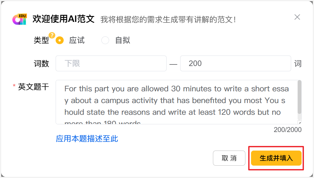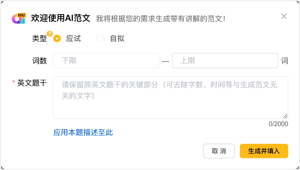 应试类型更适合生成四级、六级、专四、专八、雅思、托福、GRE等有英文题干和词数要求的题目; 而自拟则可添加标题和重点,并根据中文要求定制范文。