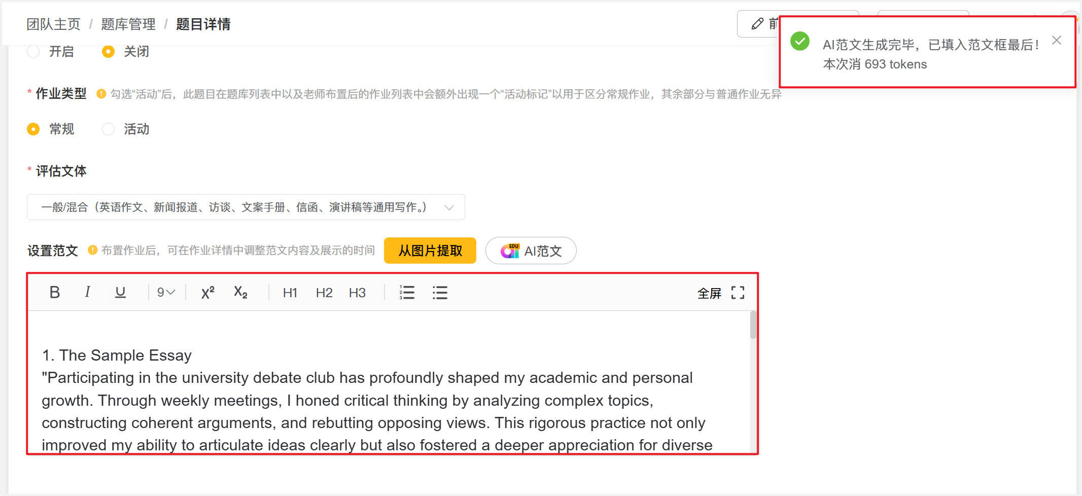 范文设置成功后,老师仍然可以在 作业详情-范文 里修改范文。