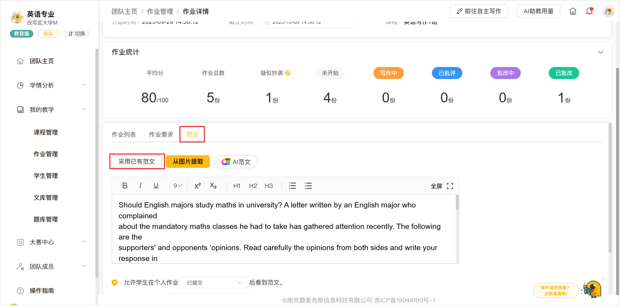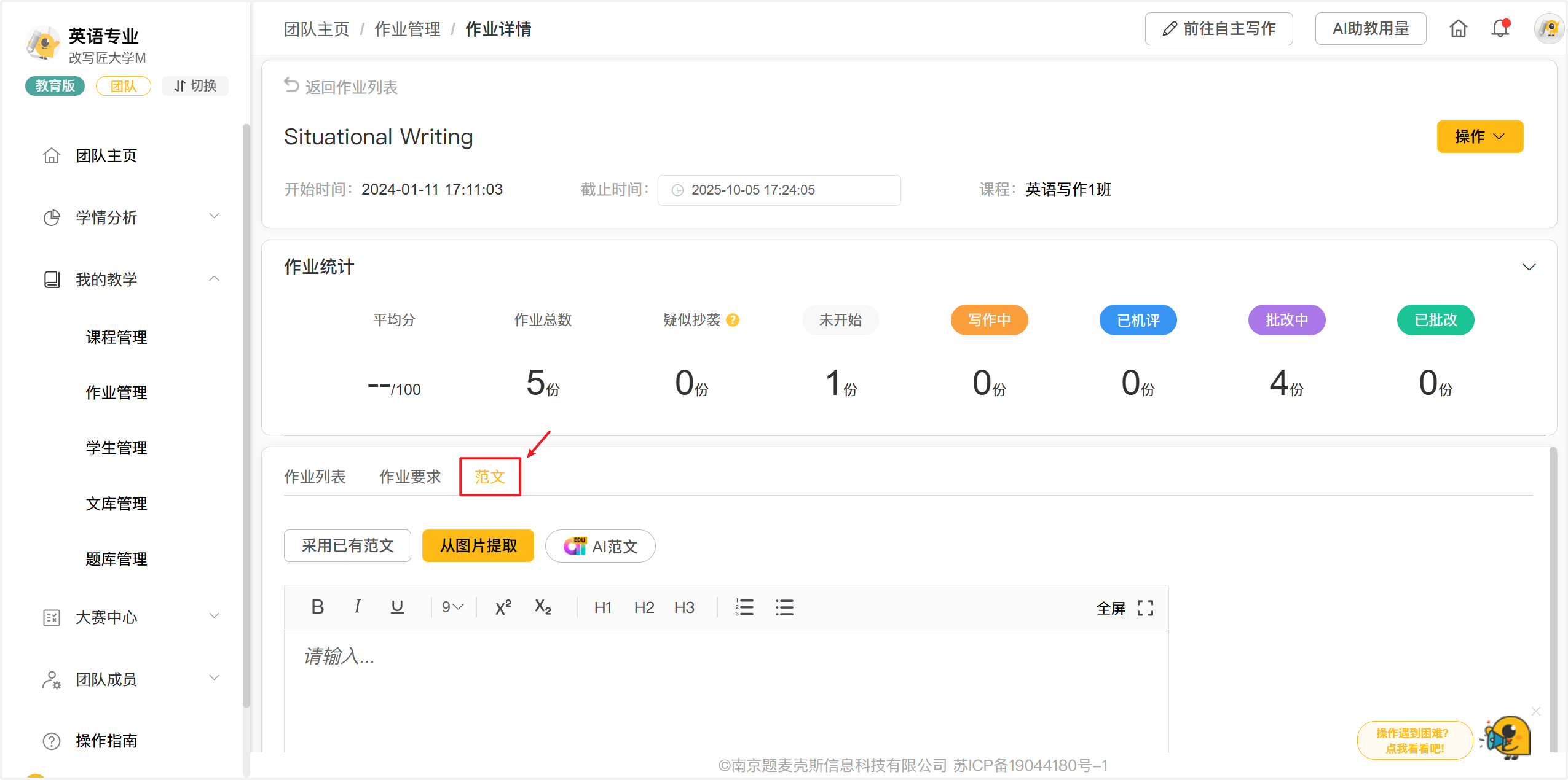 在 我的教学-作业管理-作业详情 页面,点击 范文 按钮,进入范文设置页面。