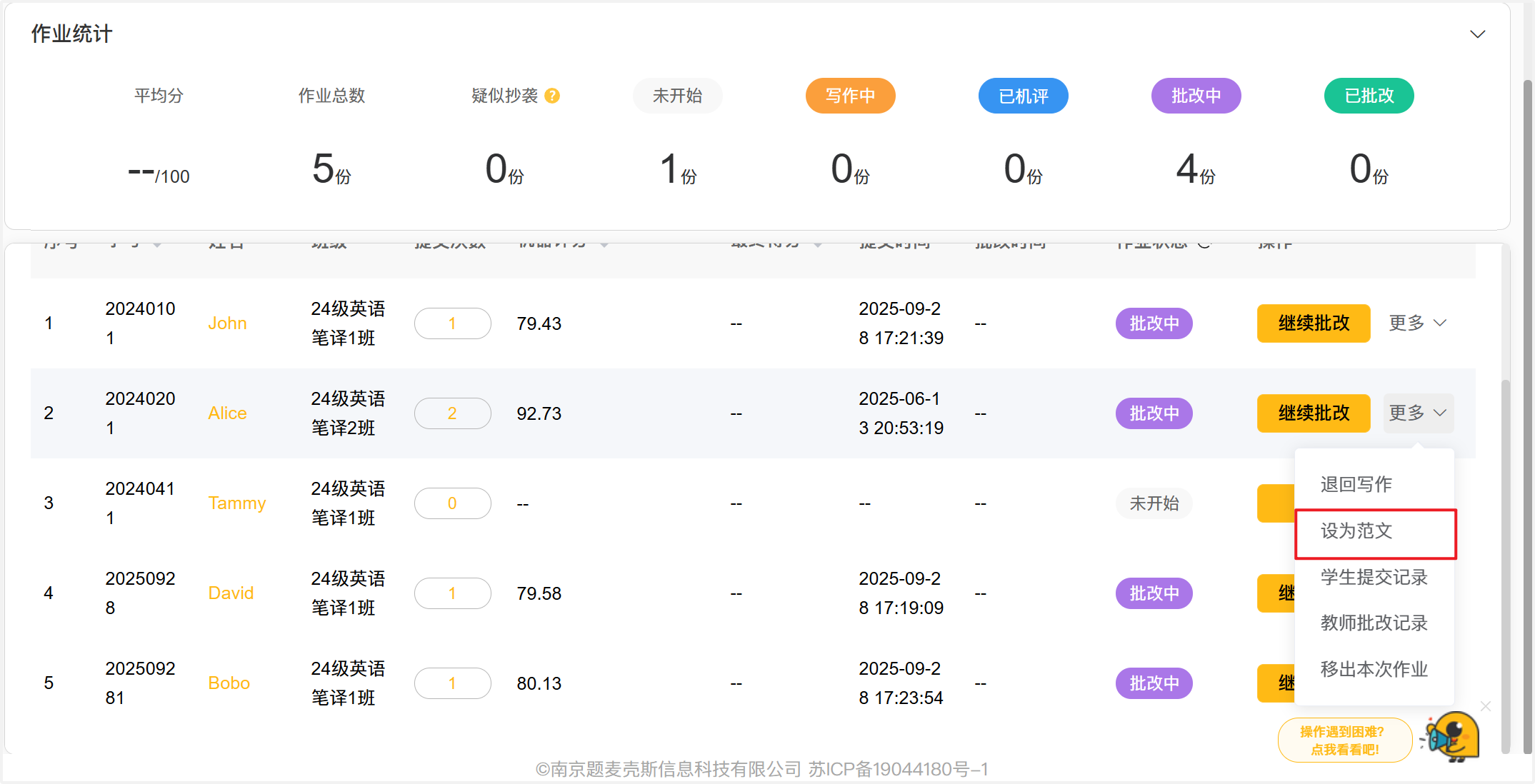 如果您想将某位学生已提交的作业设置为本次作业的范文,可以在作业详情页面的作业列表中,点击该生信息栏右侧的 更多 按钮,选择 设为范文。