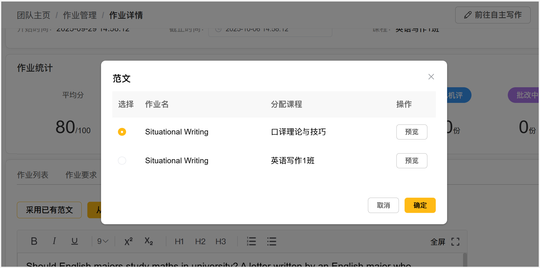 点击 采用已有范文,进入范文选择页面。点击 预览 按钮,可查看范文的内容。勾选文章,点击 确定,即可将该文章设置为本次作业的范文。