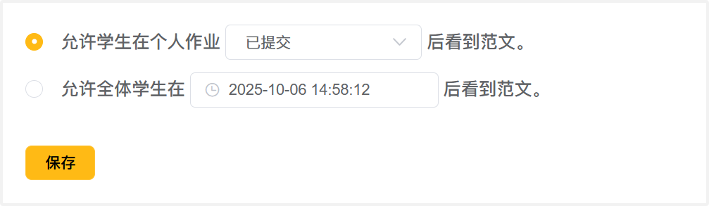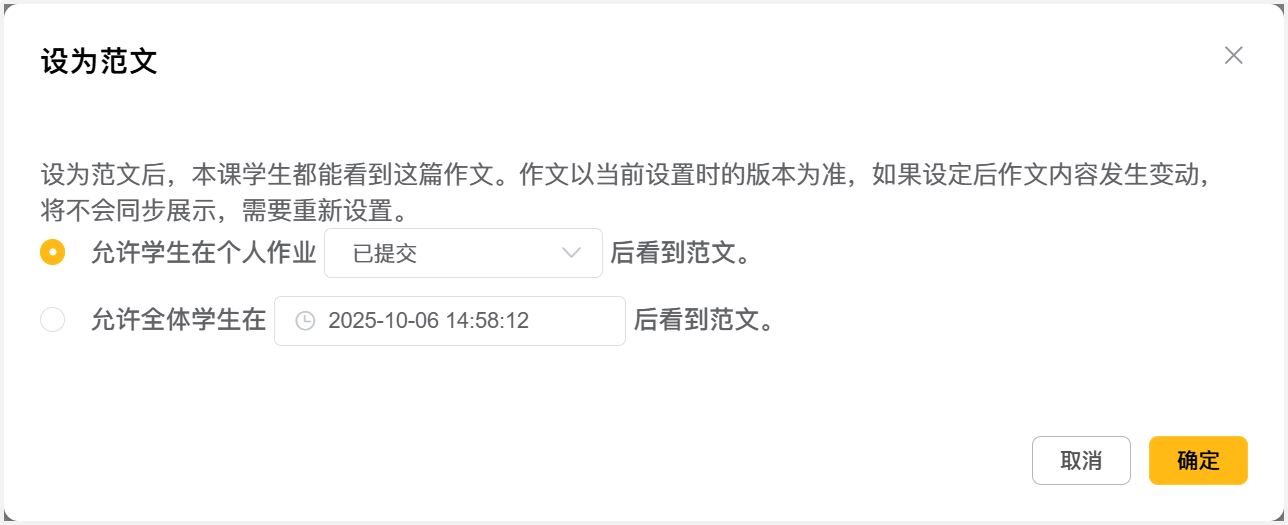 在 范文 页面,您可以设置学生可查看范文的时间。支持设置学生在作业 写作中/已提交/批改中/已批改 后查看范文,或设置学生在 某个时间点 后查看范文。