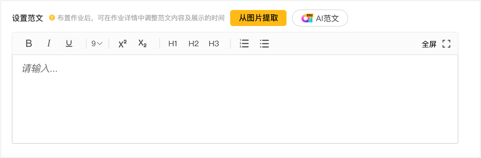 教师在布置作业时,可为作业设置AI范文。点击【AI范文】进行设置。