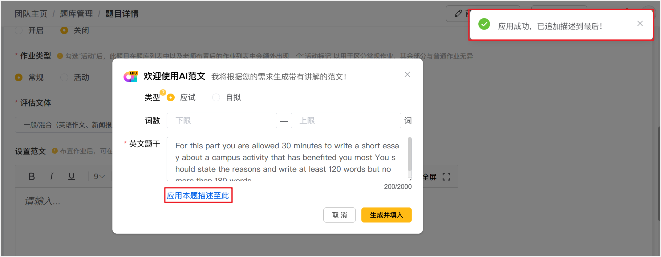 输入英文题干,或点击【应用本题描述至此】,将作业描述快速应用至【英文题干】处。