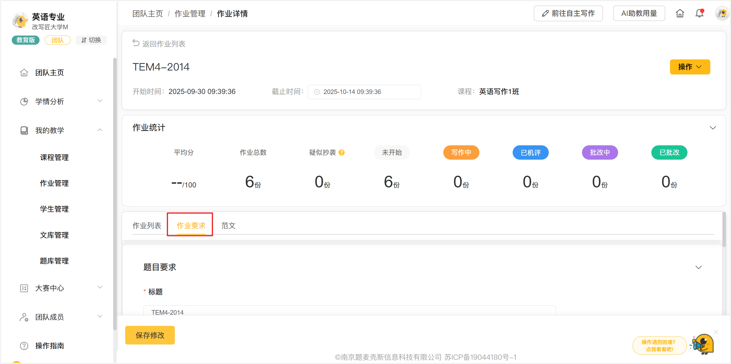如果整个课程的学生都没有收到作业,可能是因为您的作业 分配要求 中 分配对象 或者 起止时间 设置有误,您可以前往 我的教学-作业管理 页面,点击作业卡片进入 作业详情-作业要求 页面,查看作业的分配对象和布置时间是否正确。