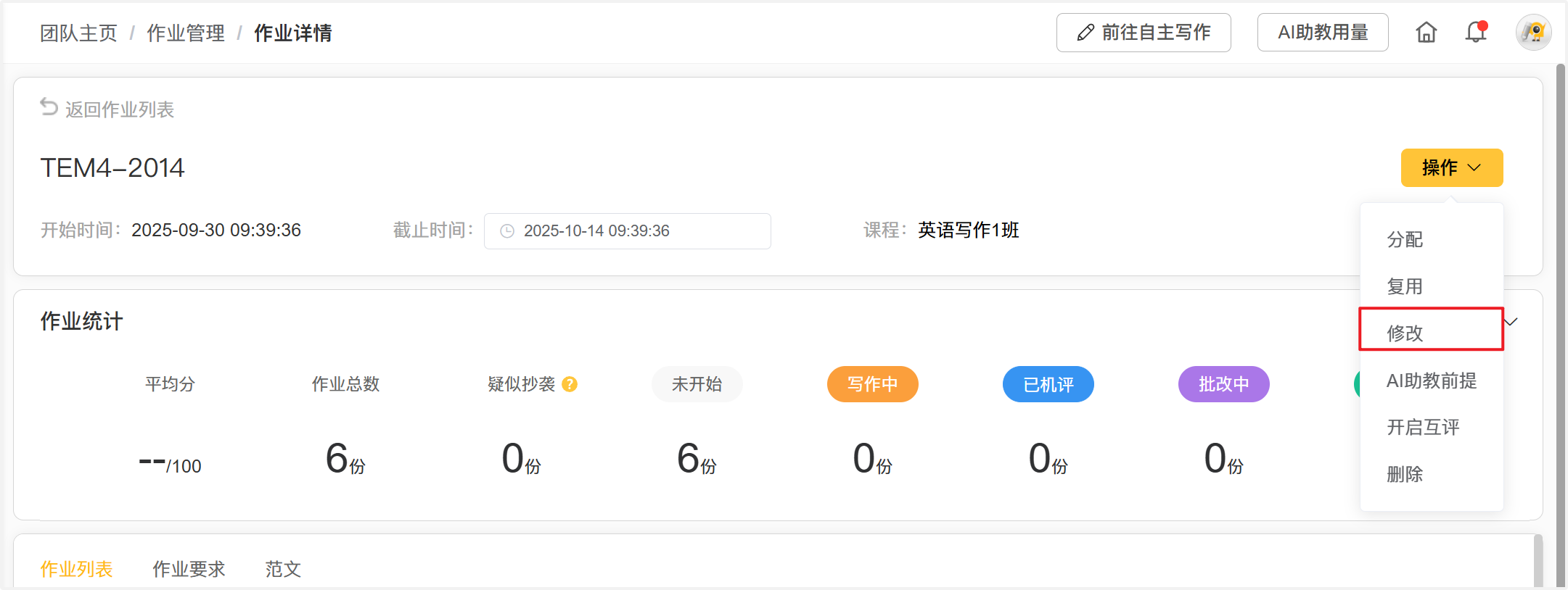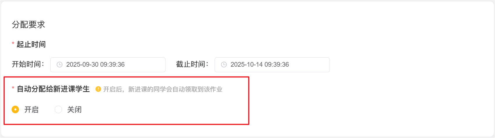 前往 作业详情-作业要求 页面,开启 自动分配给进新课学生 功能。