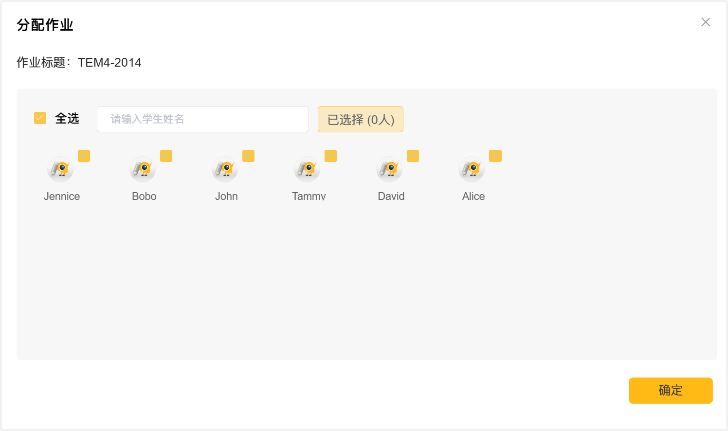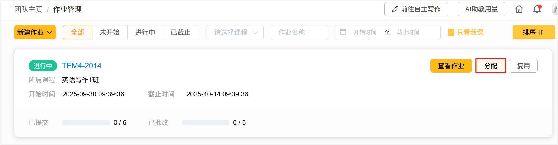 点击作业卡片的 分配 按钮,将作业分配给未收到作业的学生。