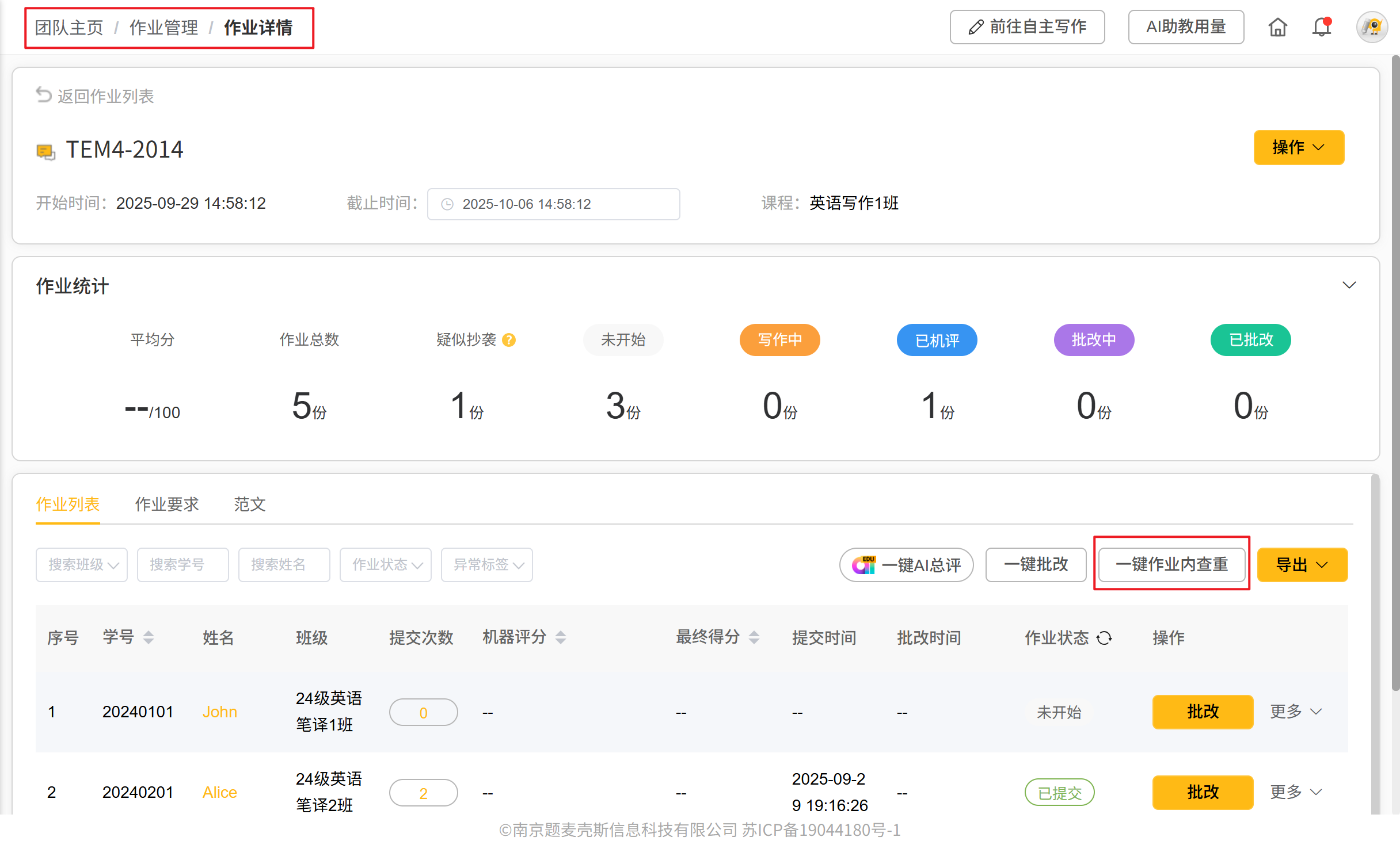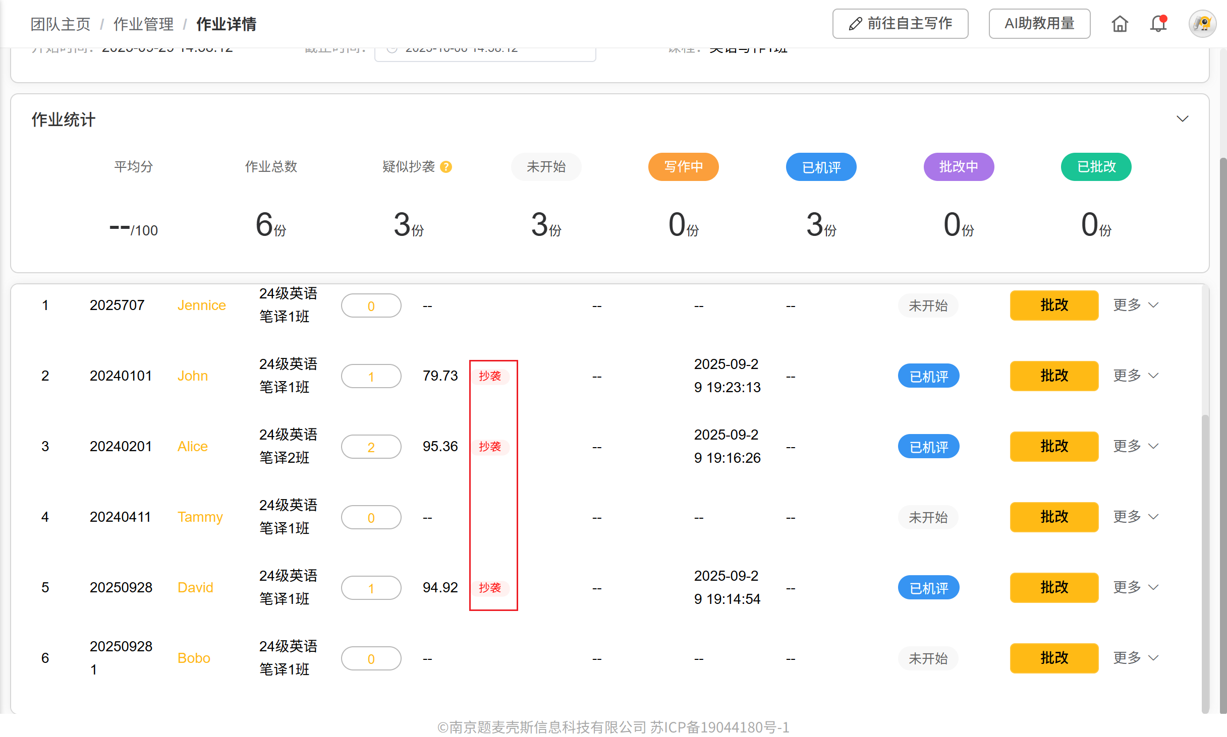 老师可以通过 一键作业内内查重 功能,对作业进行查重,如果发现作业抄袭,会在作业列表中显示 疑似抄袭或抄袭 标签。