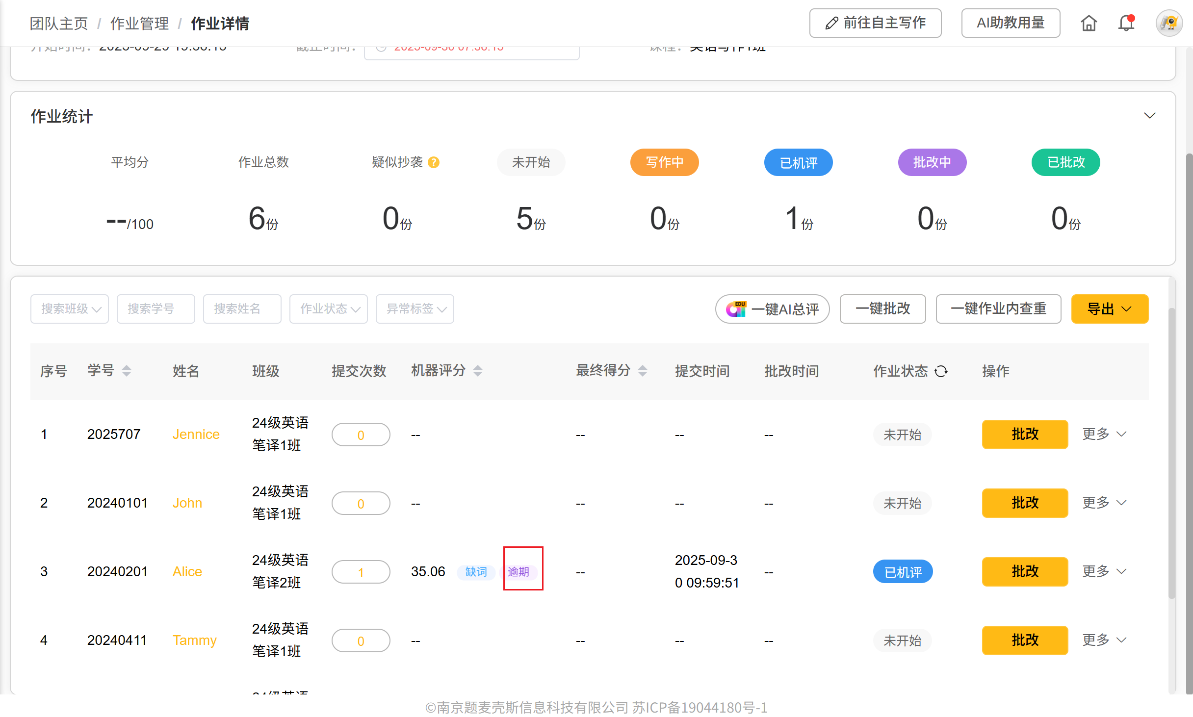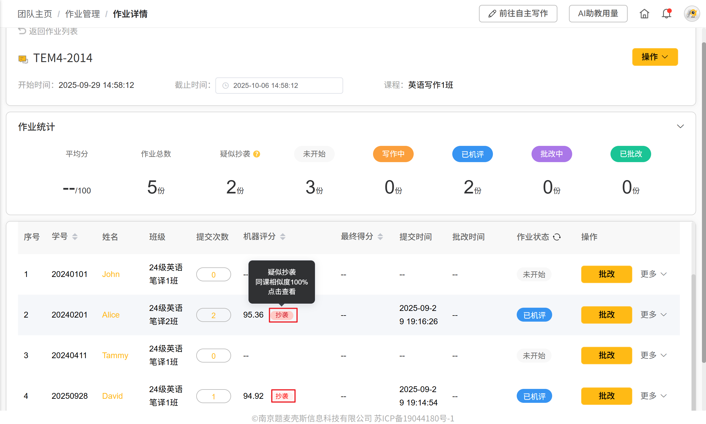 在改写匠教育版,作业共有四种异常状态,分别是: 疑似抄袭、疑似跑题、词数异常和逾期提交。当学生提交作业后,系统会自动对作业进行检测,如果发现异常,会在作业列表中显示异常标签,老师可以鼠标悬浮在标签上方,查看异常描述。