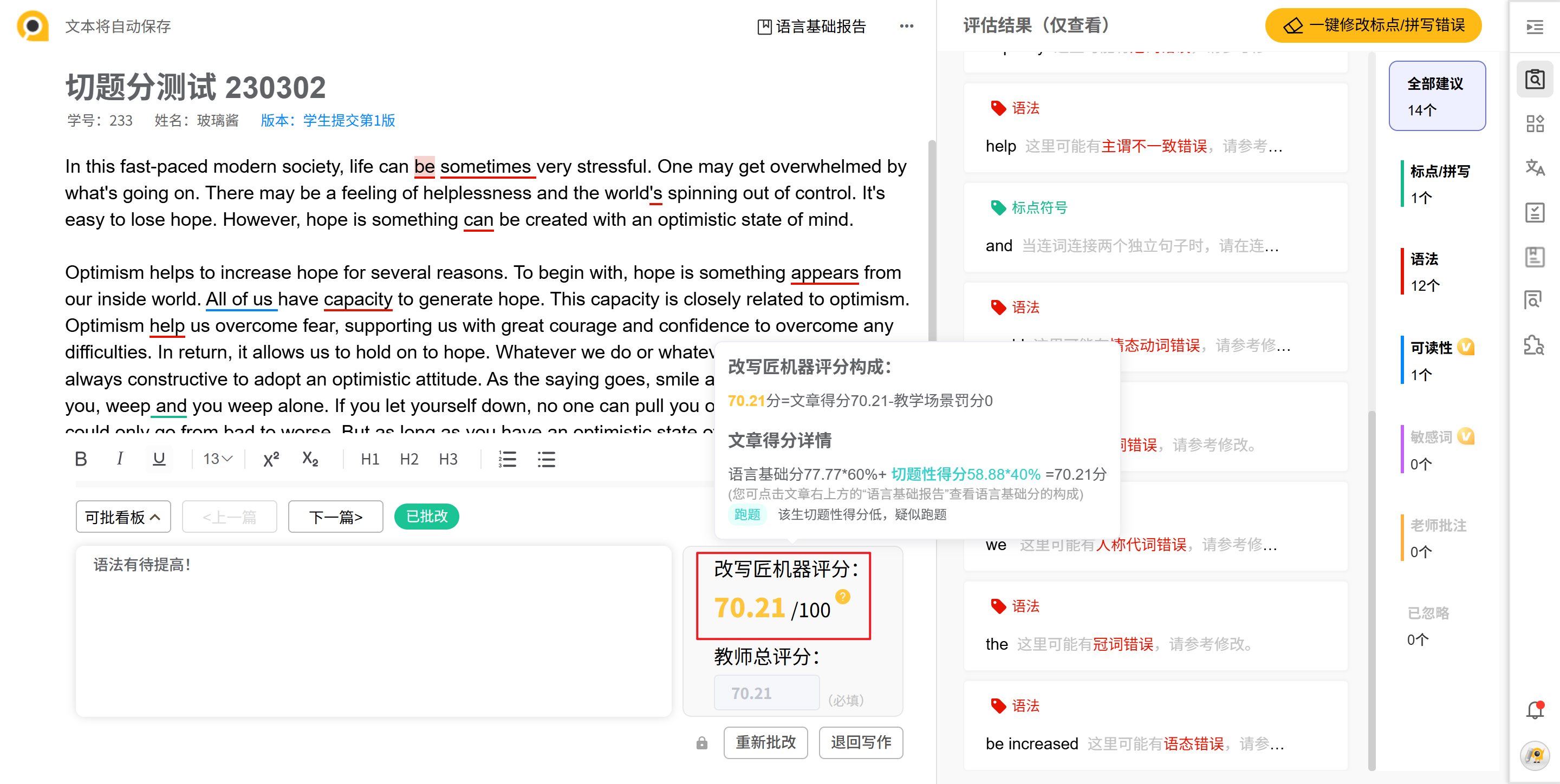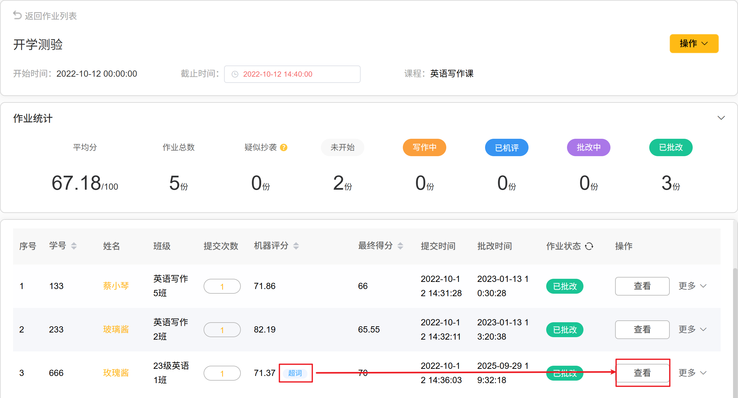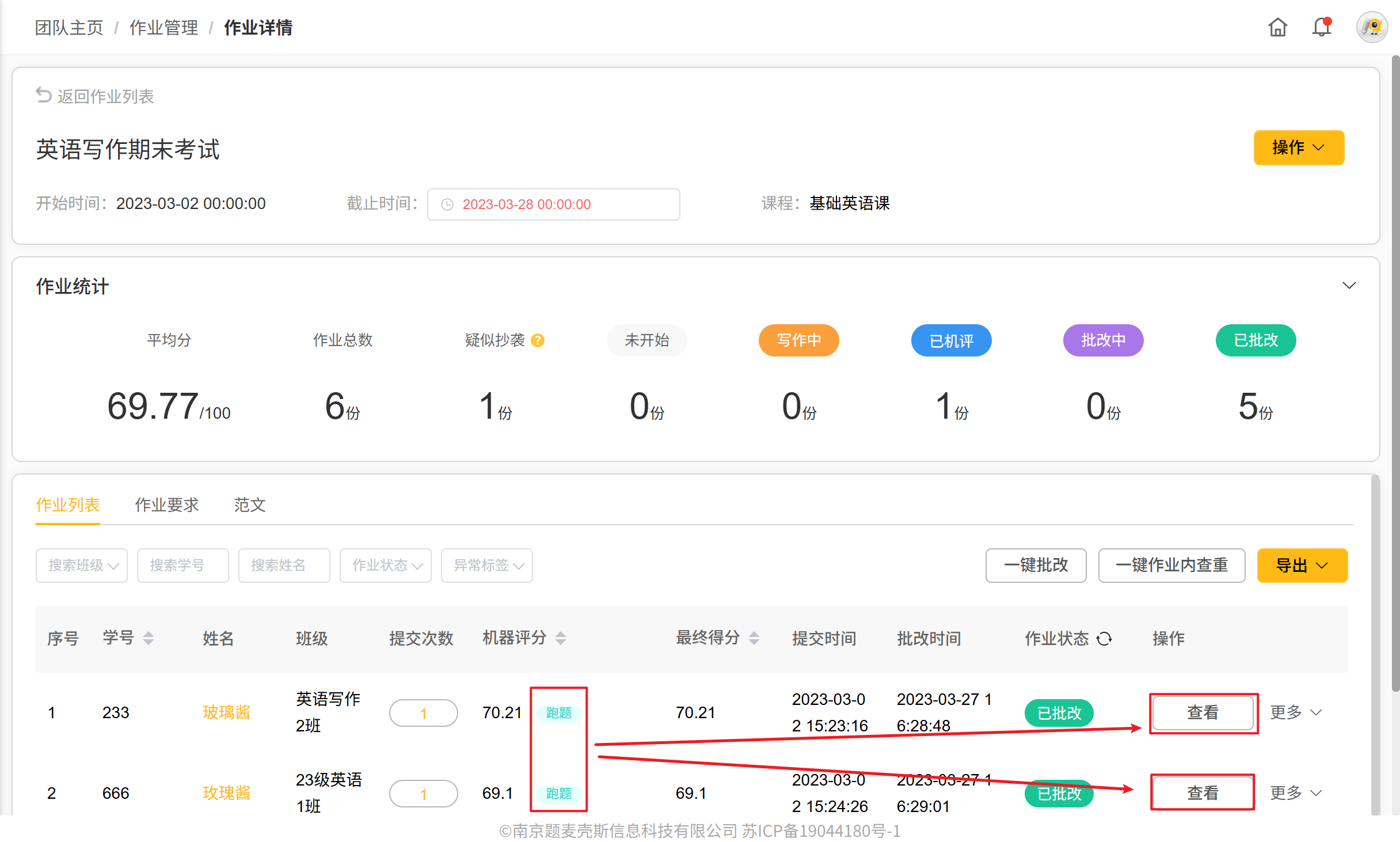 老师可前往 作业批改 页面,查看具体的切题度评分结果。