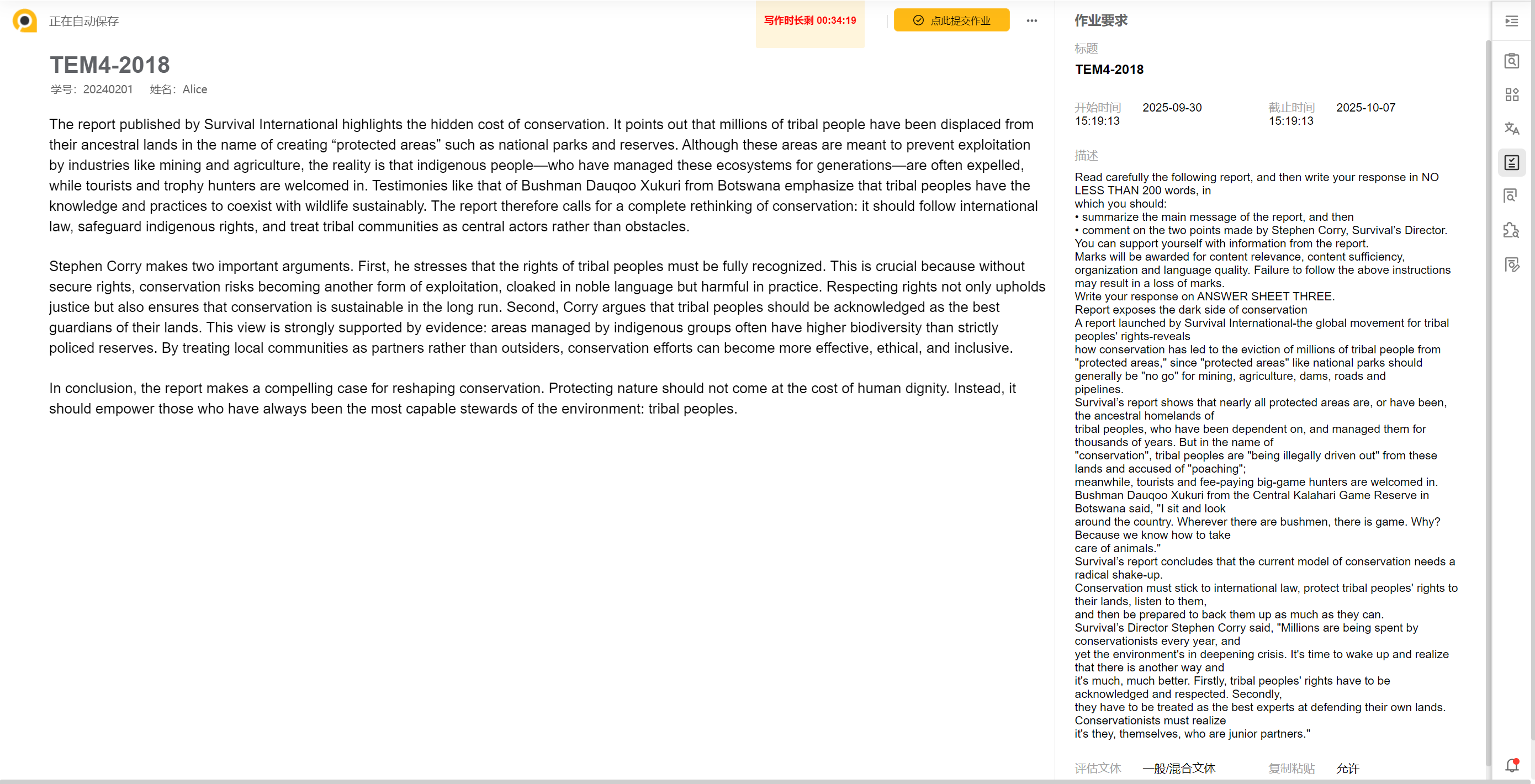 点击 去写作,进入作业编辑页面,开始答题。左侧为答题区,右侧可查看作业要求。点击右侧功能栏的图标按钮,可使用相应写作辅助功能,如:表达中心、翻译、查同义词、查搭配等。