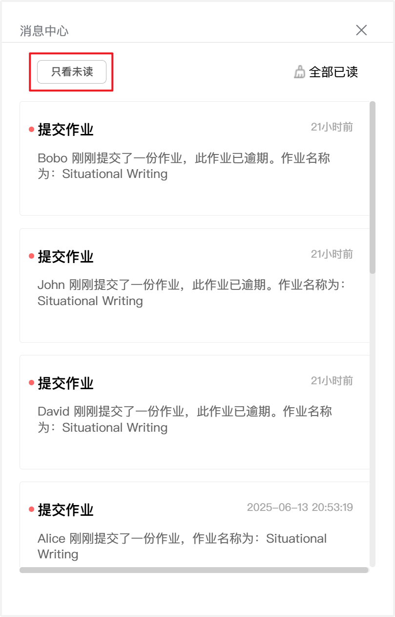 如果您只想阅读未读消息,可以点击消息中心左上方的 只看未读。您也可以点击右上角的 全部已读,将已收到的消息全部比标记为已读状态。