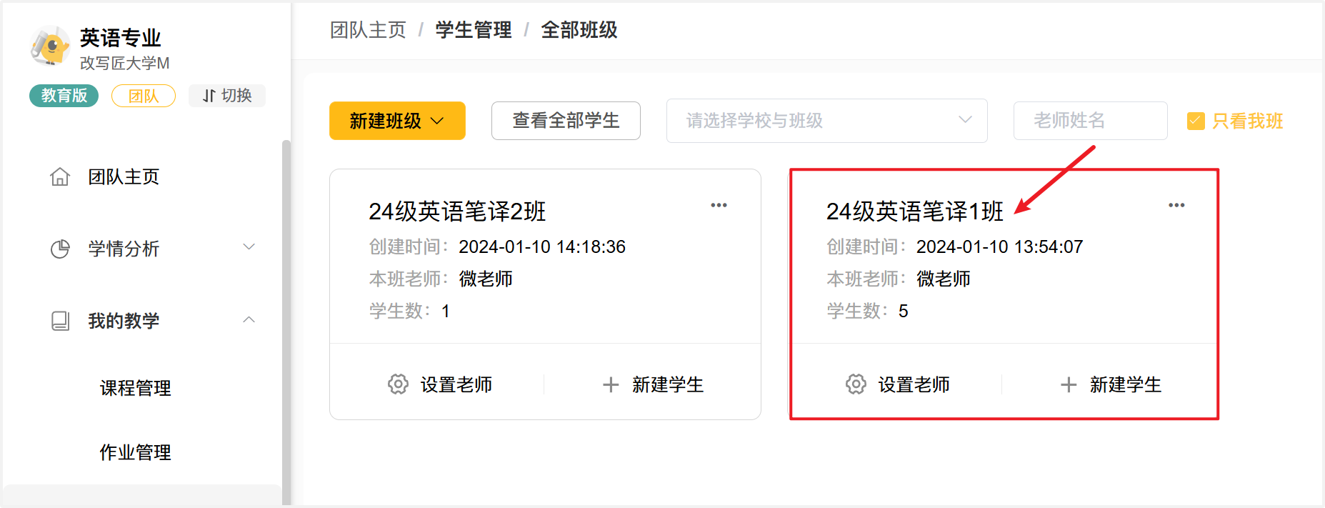 在 学生管理-班级列表 点击任意班级卡片,即可进入班级管理界面。
