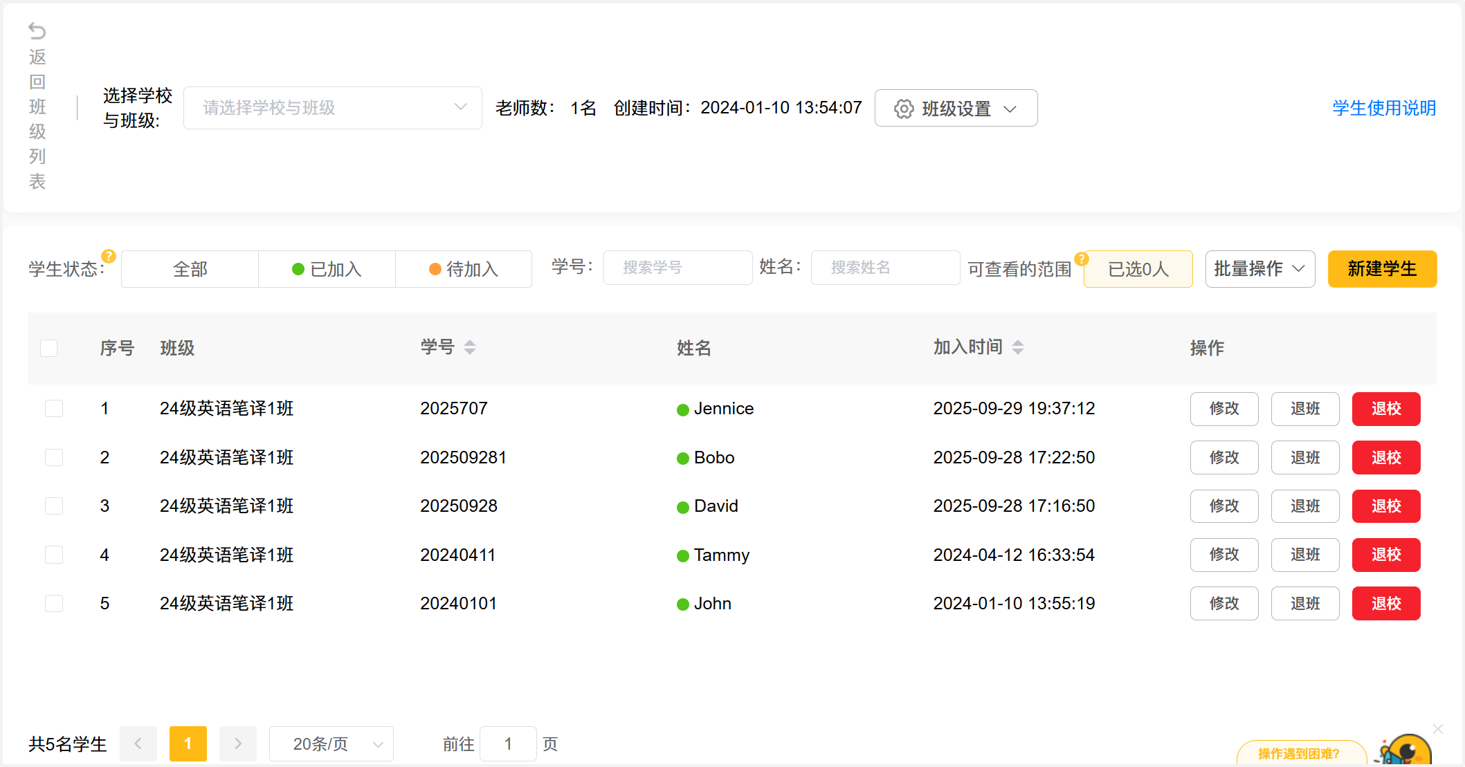 点击空间主页的 学生管理 或团队主页 我的教学-学生管理,即可进入学生管理,即学生池页面。