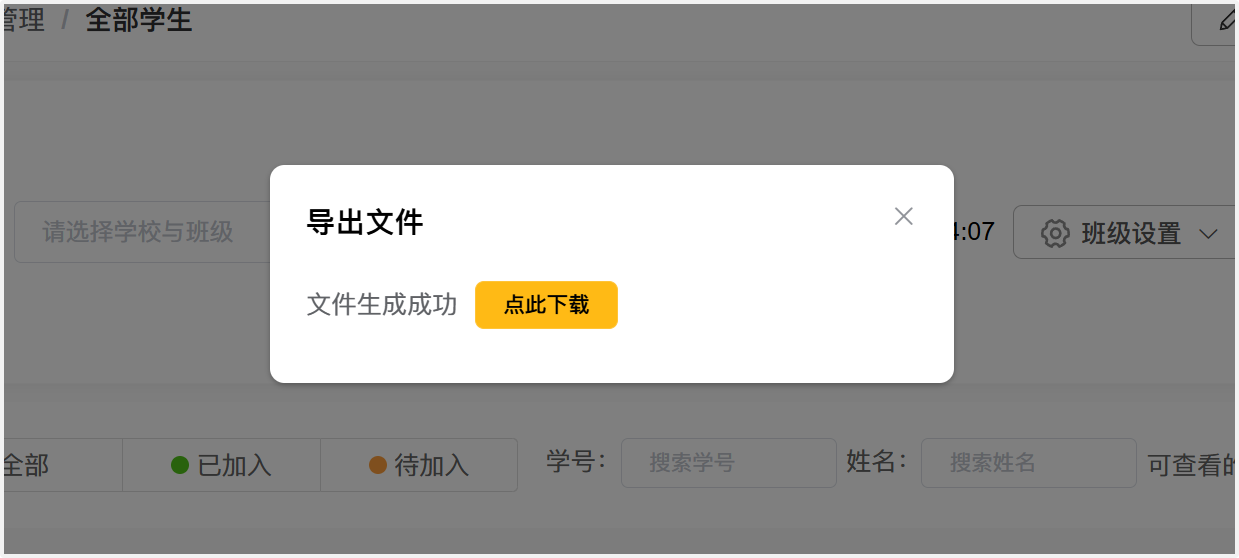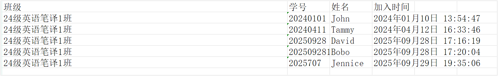 导出名单功能,支持导出班内学生的班级、学号、姓名和加入时间信息。导出的文件格式为Excel。