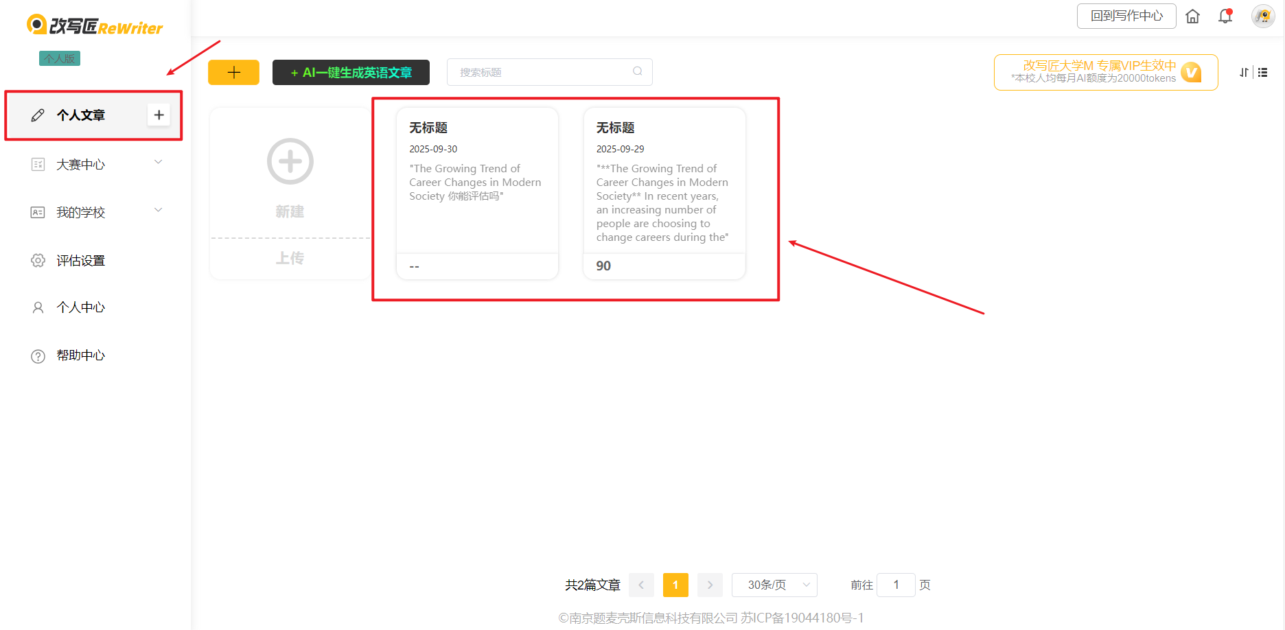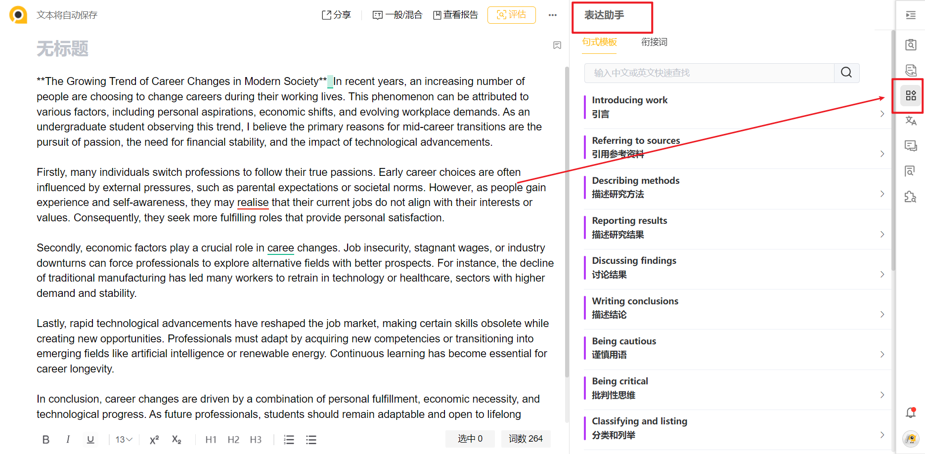 在改写匠个人版,点击 个人文章,选择一篇文章,进入文章编辑页面,点击右侧功能栏从上往下数第三个按钮,即可进入 表达助手。