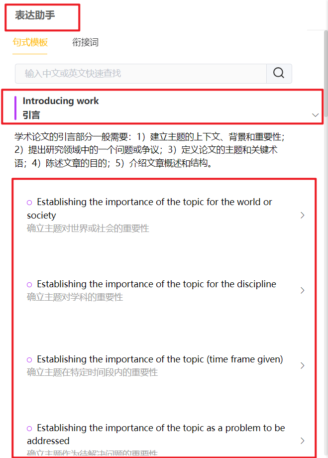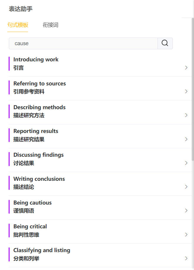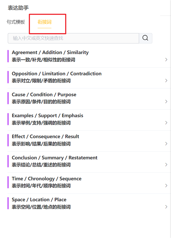 改写匠的表达助手包含了以下功能:句型模板和衔接词。支持中英关键词搜索,帮你快速找到想要的表达。