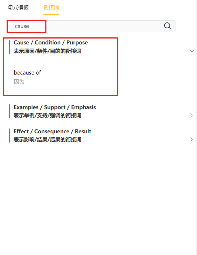 不论是句型模板还是衔接词功能,都支持中英文快速搜索。写作遇到瓶颈?随手查一查,也许就有意想不到的收获。