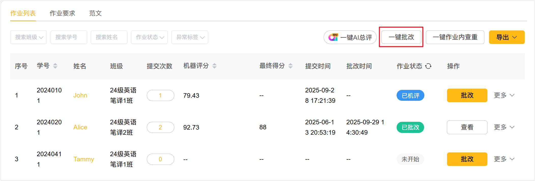 在改写匠教育版,学生提交作业后,将自动对作业进行机器评分,并在 机器评分 一列显示评分结果。此时,老师可以通过一键批改,将学生作业的机器评分应用为最终得分。