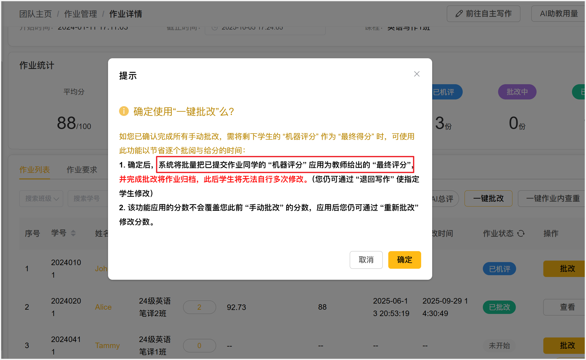 系统将把该作业的机器评分应用为最终评分,该分数不会覆盖您此前手动批改的分数。应用后,您仍可以通过 重新批改 功能,对作业进行手动批改。