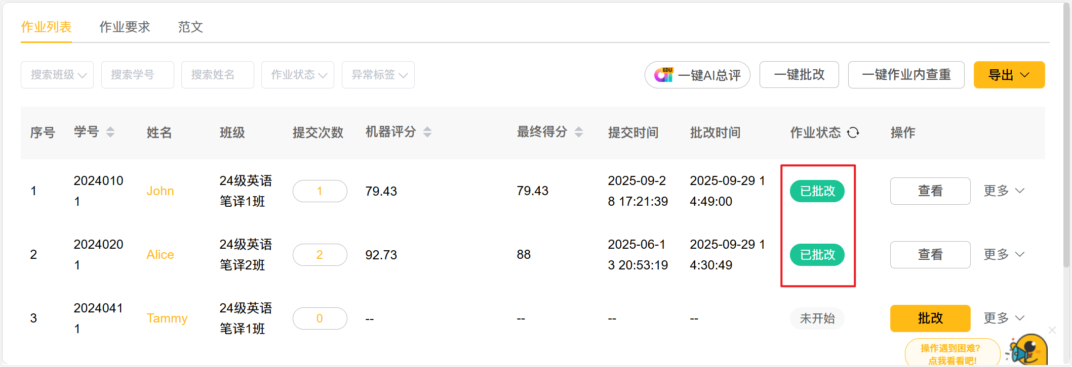 应用机器评分后,作业列表中学生作业状态将变为 已批改。