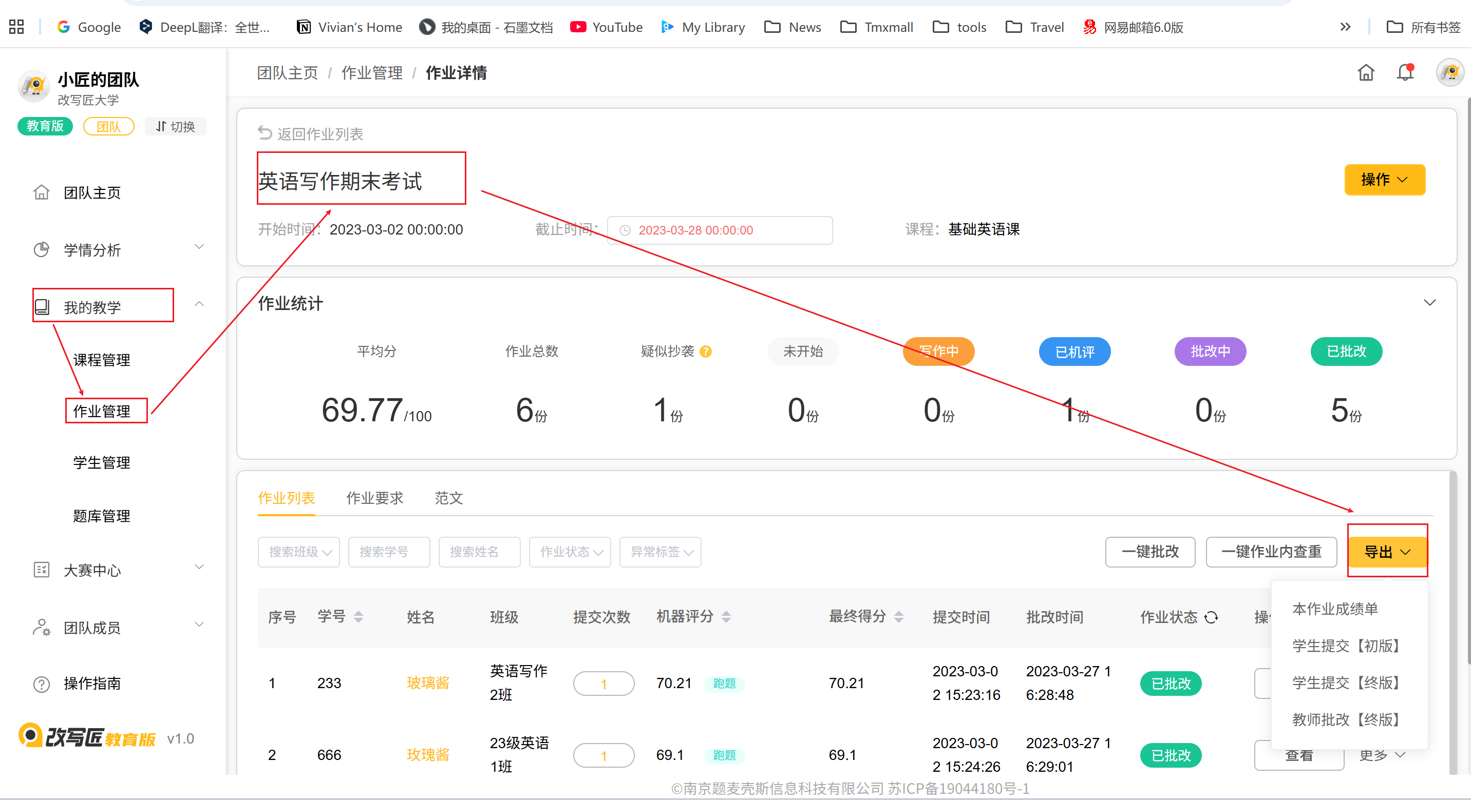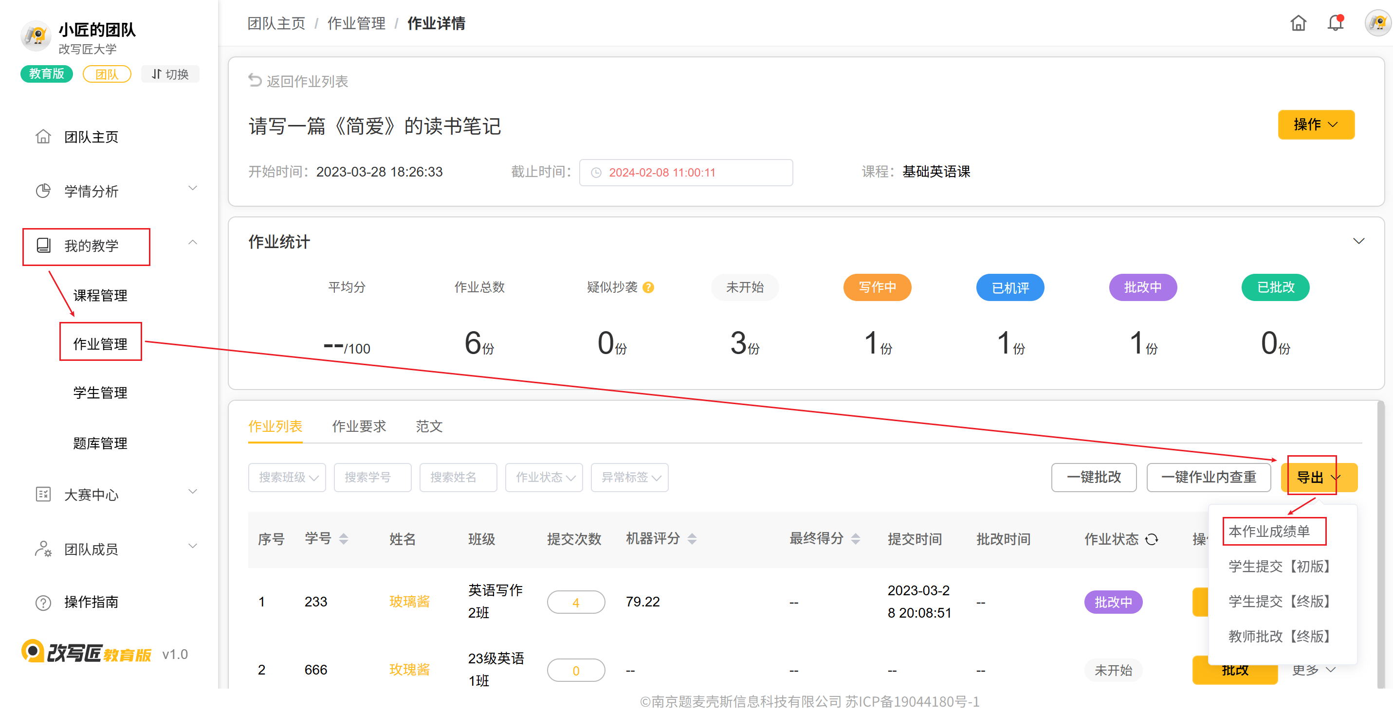 您可以在完成作业批改后,下载本次作业的成绩单。在 我的教学-作业管理-作业详情 页面,点击 导出,选择 导出成绩单,即可下载当前作业下已批改的作业成绩单(xlsx格式)。