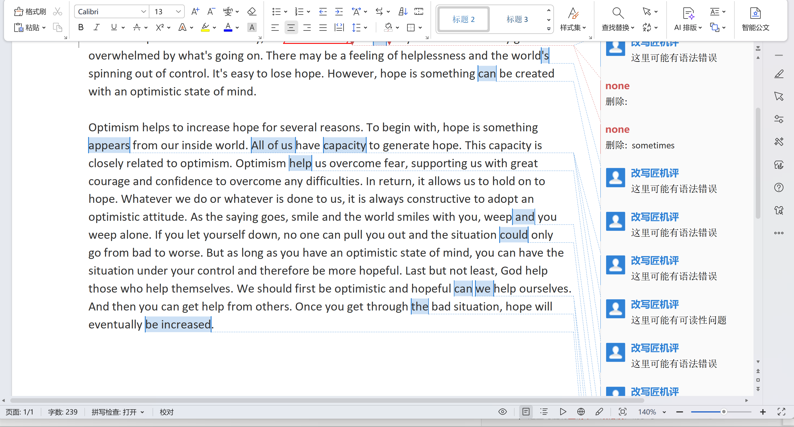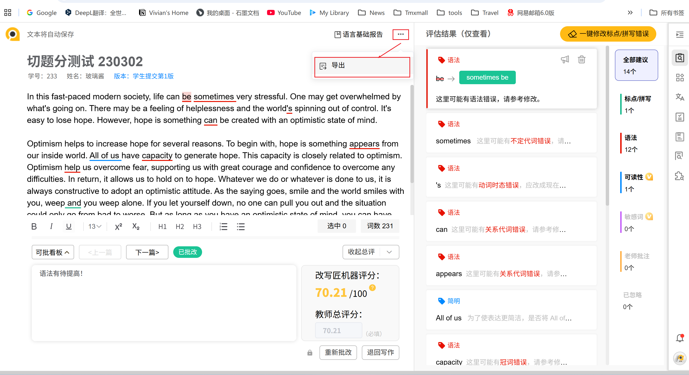 如果老师在批量下载作业或导出单个文档时,已经完成了作业批改,并添加了 跟踪修订,下载后的文档将保留跟踪修订痕迹,并用 红色下划线 标注改写匠智能检测出的英文语法/词汇错误,蓝色下划线 标注可读性错误。
