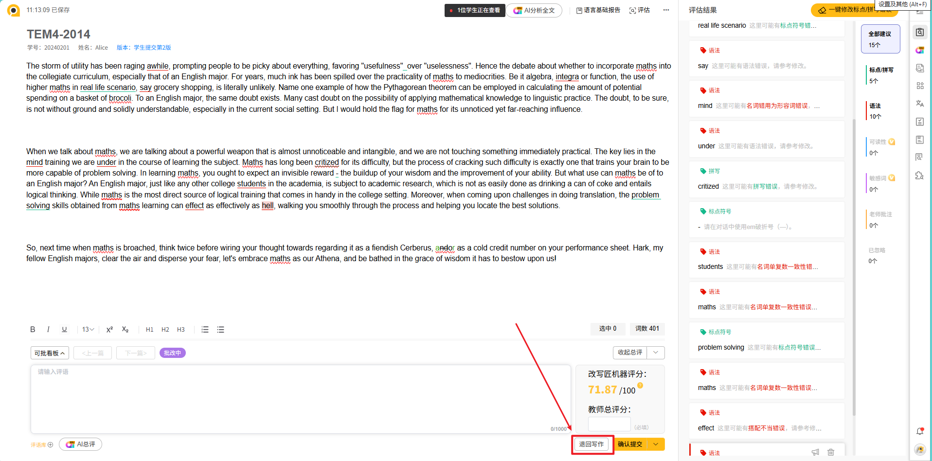 被退回的作业内容 不会被清空,而是保留了您上一个版本的作业内容,以及老师批注、跟踪修订等信息。您可以在此基础上,对作业进行修改。
