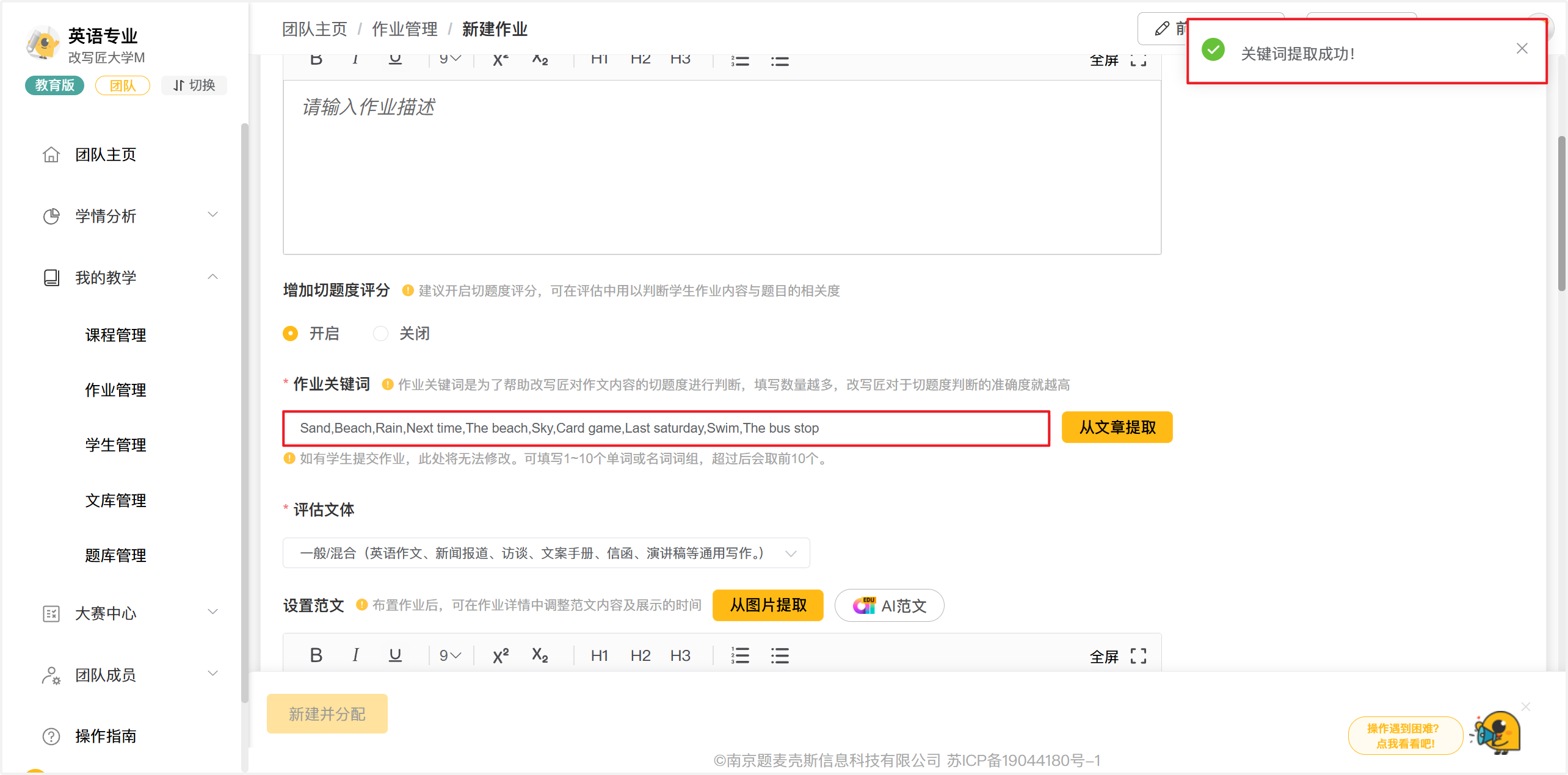 如果教师在布置作业时开启了切题度评分,则需要填写作业关键词。作业关键词支持手动输入,也支持从文章提取。以下是提取方法。